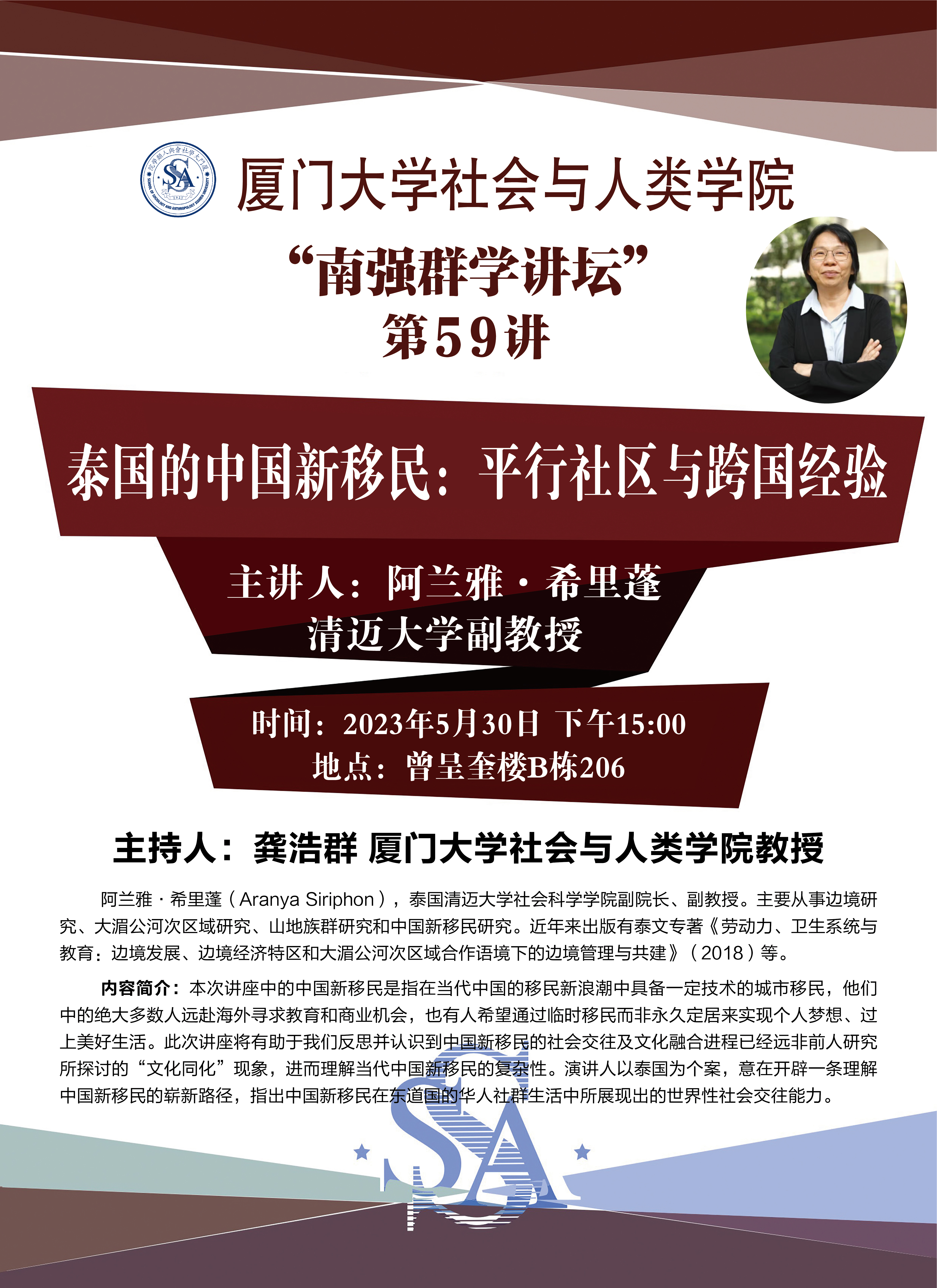 内容简介:本次讲座中的中国新移民是指在当代中国的移民新浪潮中具备一定技术的城市移民,他们中的绝大多数人远赴海外寻求教育和商业机会,也有人希望通过临时移民而非永久定居来实现个人梦想、过上美好生活。此次讲座将有助于我们反思并认识到中国新移民的社会交往及文化融合进程已经远非前人研究所探讨的“文化同化”现象,进而理解当代中国新移民的复杂性。演讲人以泰国为个案,意在开辟一条理解中国新移民的崭新路径,指出中国新移民在东道国的华人社群生活中所展现出的世界性社会交往能力。