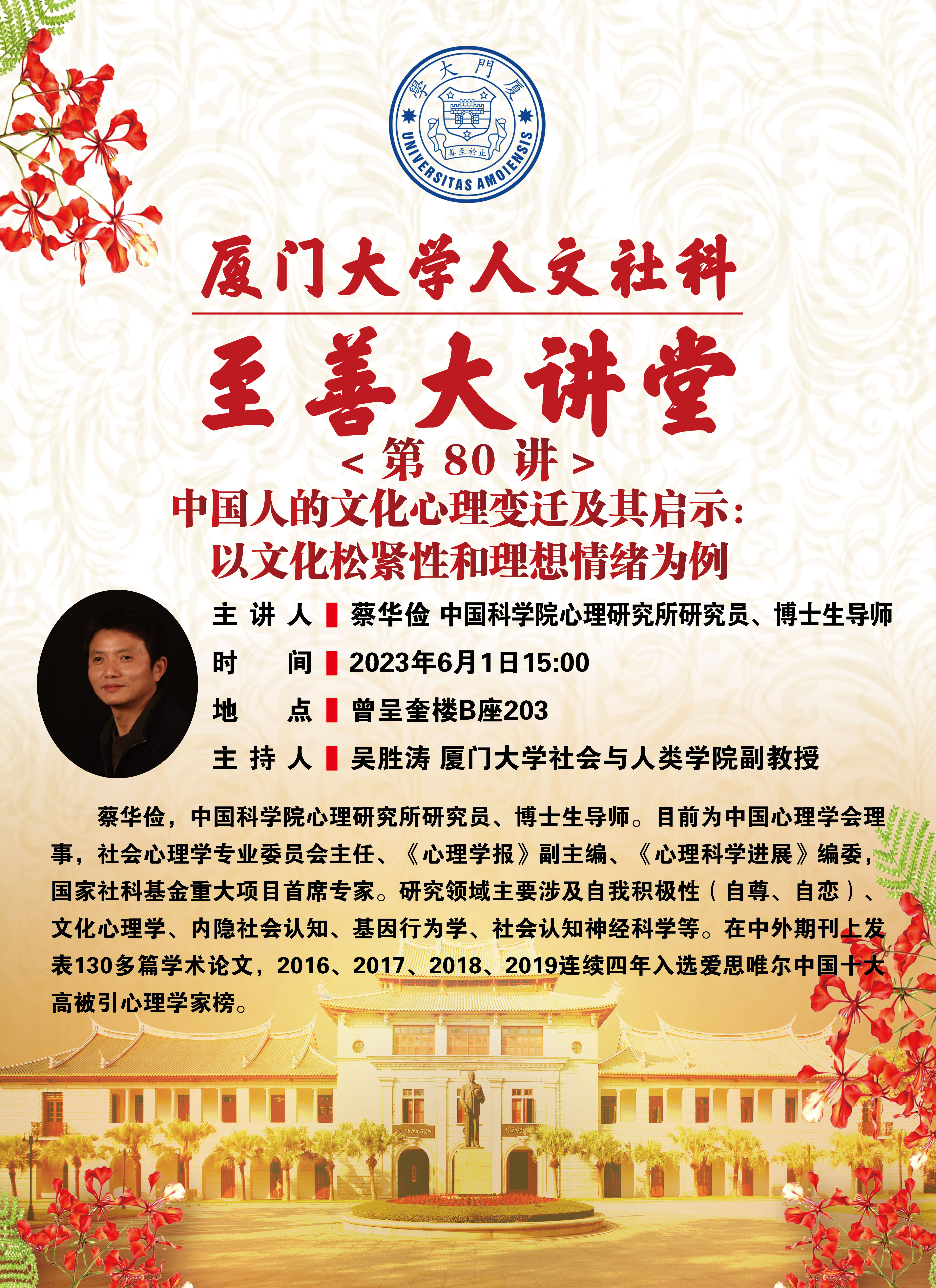 主讲人简介:蔡华俭,中国科学院心理研究所研究员、博士生导师。目前为中国心理学会理事,社会心理学专业委员会主任、《心理学报》副主编、《心理科学进展》编委,国家社科基金重大项目首席专家。研究领域主要涉及自我积极性(自尊、自恋)、文化心理学、内隐社会认知、基因行为学、社会认知神经科学等。在中外期刊上发表130多篇学术论文,2016、2017、2018、2019连续四年入选爱思唯尔中国十大高被引心理学家榜。