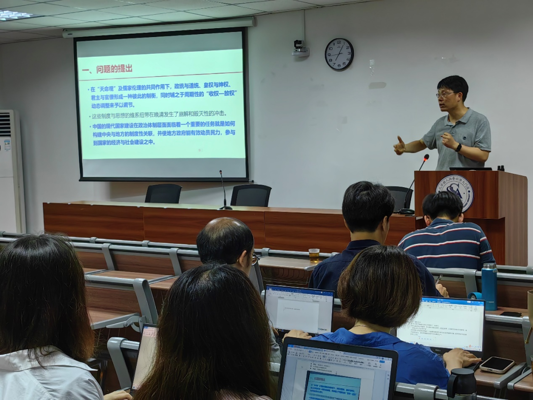 近日,我院邀请华中科技大学社会学院狄金华教授做客南强学术讲座,讲座在曾呈奎楼B座208教室举行。狄金华教授带来了题为“改官制与建新朝:现代国家建设中的省制议题”的精彩讲座。讲座由黄晓星教授主持,他对狄金华教授的到来表示热烈欢迎,并代表学院为狄金华教授颁发南强学术讲座纪念牌。