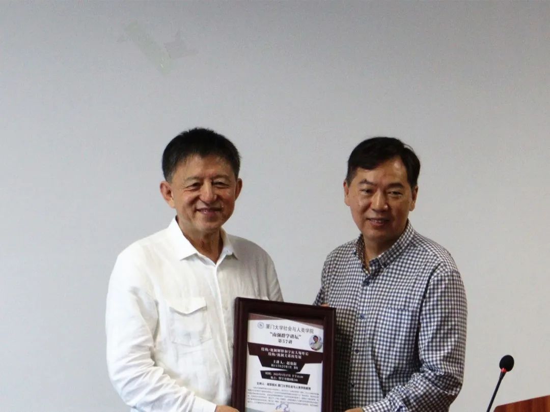 最后,院长胡荣教授为赵鼎新教授颁发讲座纪念牌并合影留念,赵鼎新教授对社会与人类学院师生的支持表示感谢,本期讲座在师生们热烈的掌声中圆满落幕。