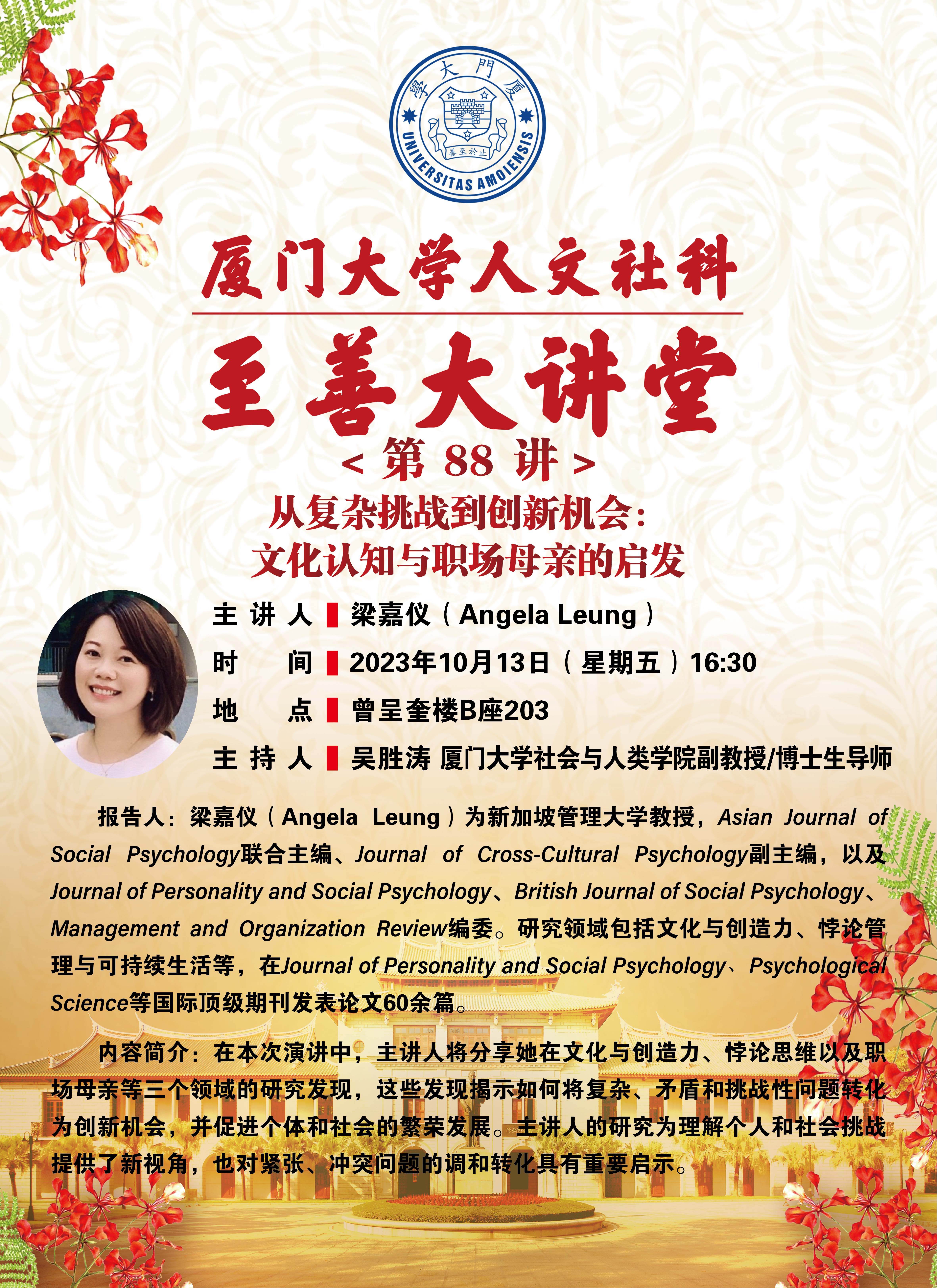 主讲人简介:梁嘉仪(Angela Leung)为新加坡管理大学教授, Asian Journal of Social Psychology联合主编、Journal of Cross-Cultural Psychology副主编, 以及Journal of Personality and Social Psychology、British Journal of Social Psychology、Management and Organization Review编委。研究领域包括文化与创造力、悖论管理与可持续生活等,在 Journal of Personality and Social Psychology、Psychological Science等国际顶级期刊发表论文60余篇。