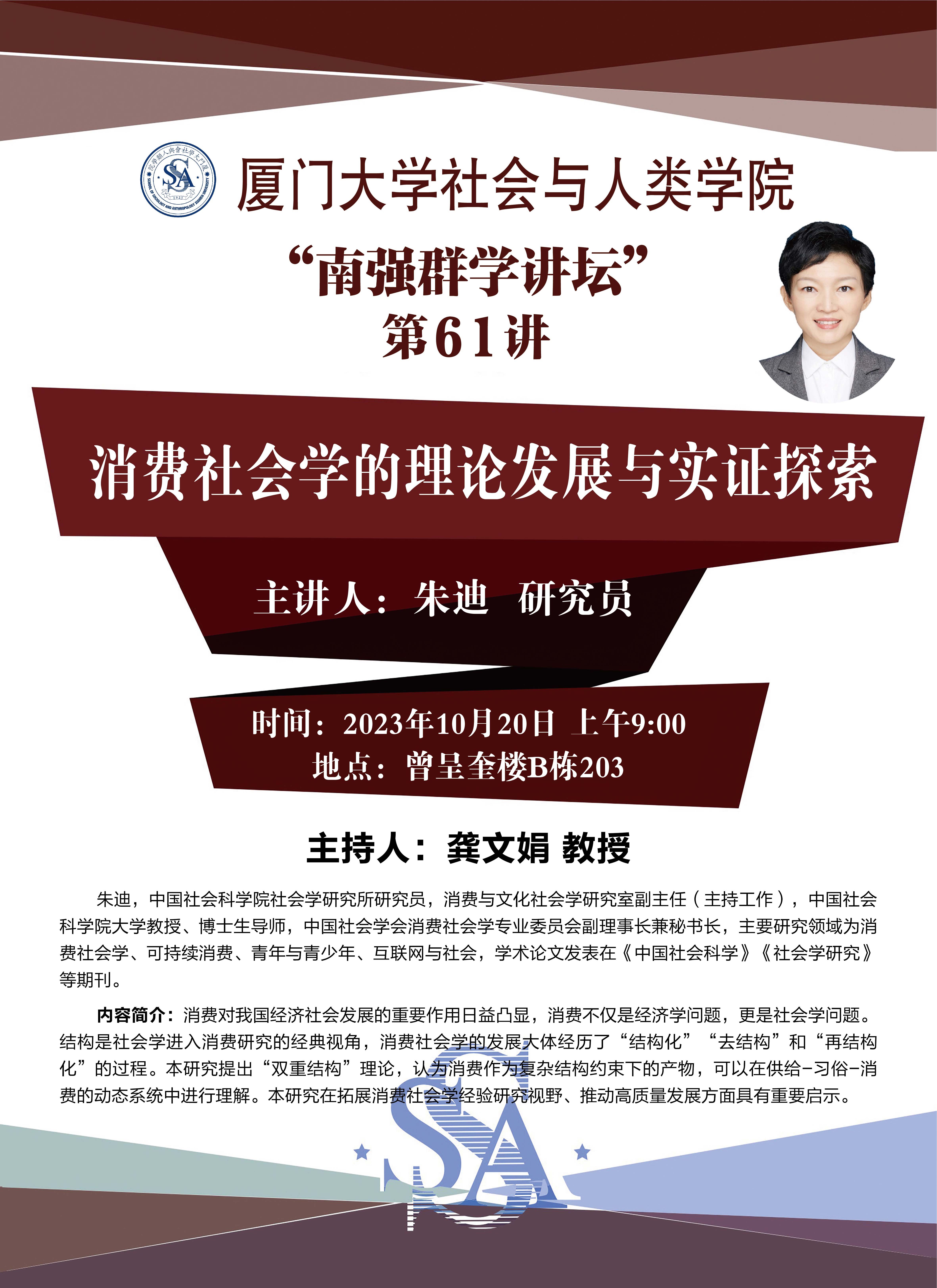 主讲人简介:朱迪,中国社会科学院社会学研究所研究员,消费与文化社会学研究室副主任(主持工作),中国社会科学院大学教授、博士生导师,中国社会学会消费社会学专业委员会副理事长兼秘书长,主要研究领域为消费社会学、可持续消费、青年与青少年、互联网与社会,学术论文发表在《中国社会科学》《社会学研究》等期刊。
