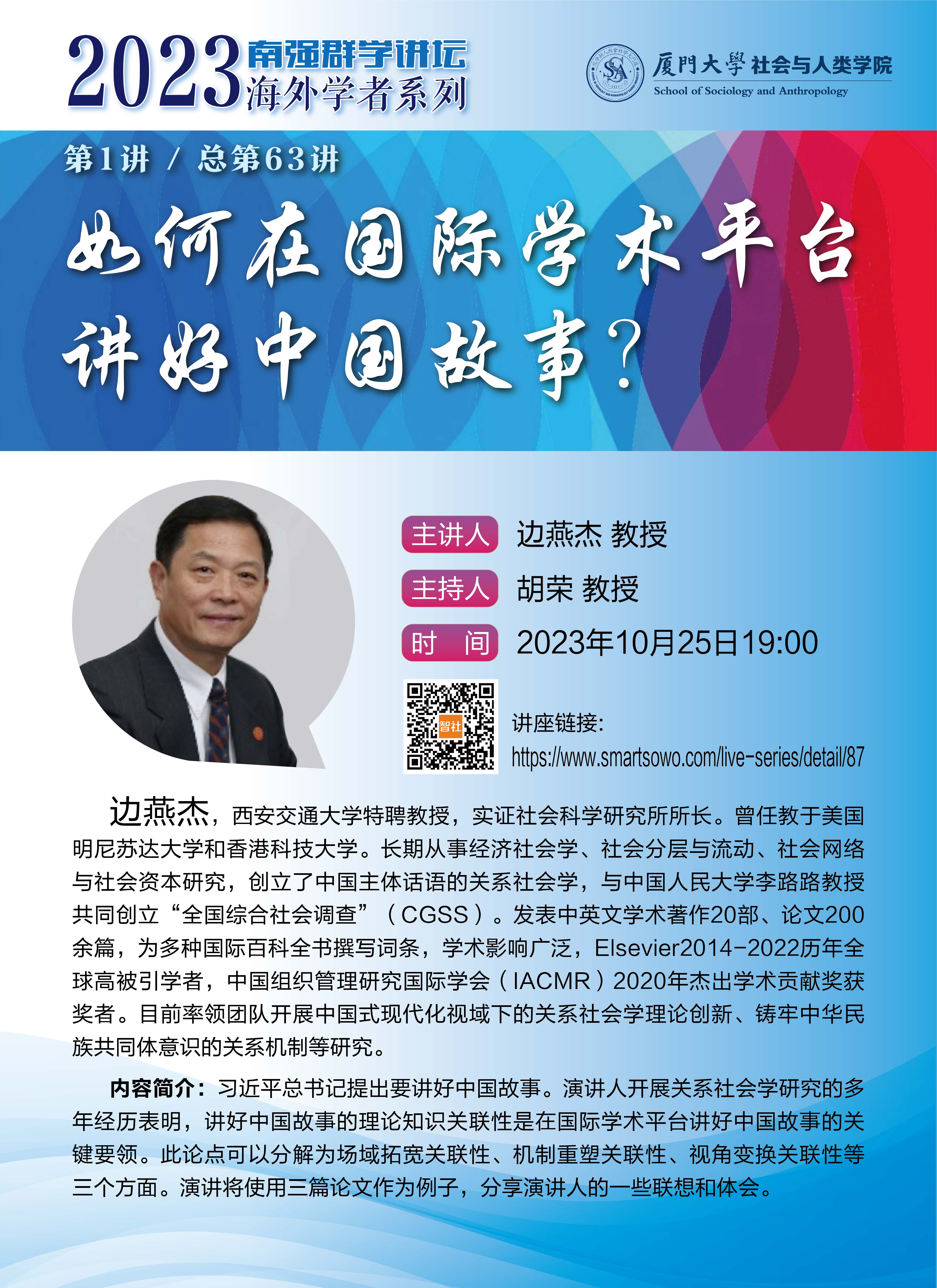 主讲人简介:边燕杰,西安交通大学特聘教授,实证社会科学研究所所长。曾任教于美国明尼苏达大学和香港科技大学。长期从事经济社会学、社会分层与流动、社会网络与社会资本研究,创立了中国主体话语的关系社会学,与中国人民大学李路路教授共同创立“全国综合社会调查”(CGSS)。发表中英文学术著作20部、论文200余篇,为多种国际百科全书撰写词条,学术影响广泛,Elsevier2014-2022历年全球高被引学者,中国组织管理研究国际学会(IACMR)2020年杰出学术贡献奖获奖者。目前率领团队开展中国式现代化视域下的关系社会学理论创新、铸牢中华民族共同体意识的关系机制等研究。