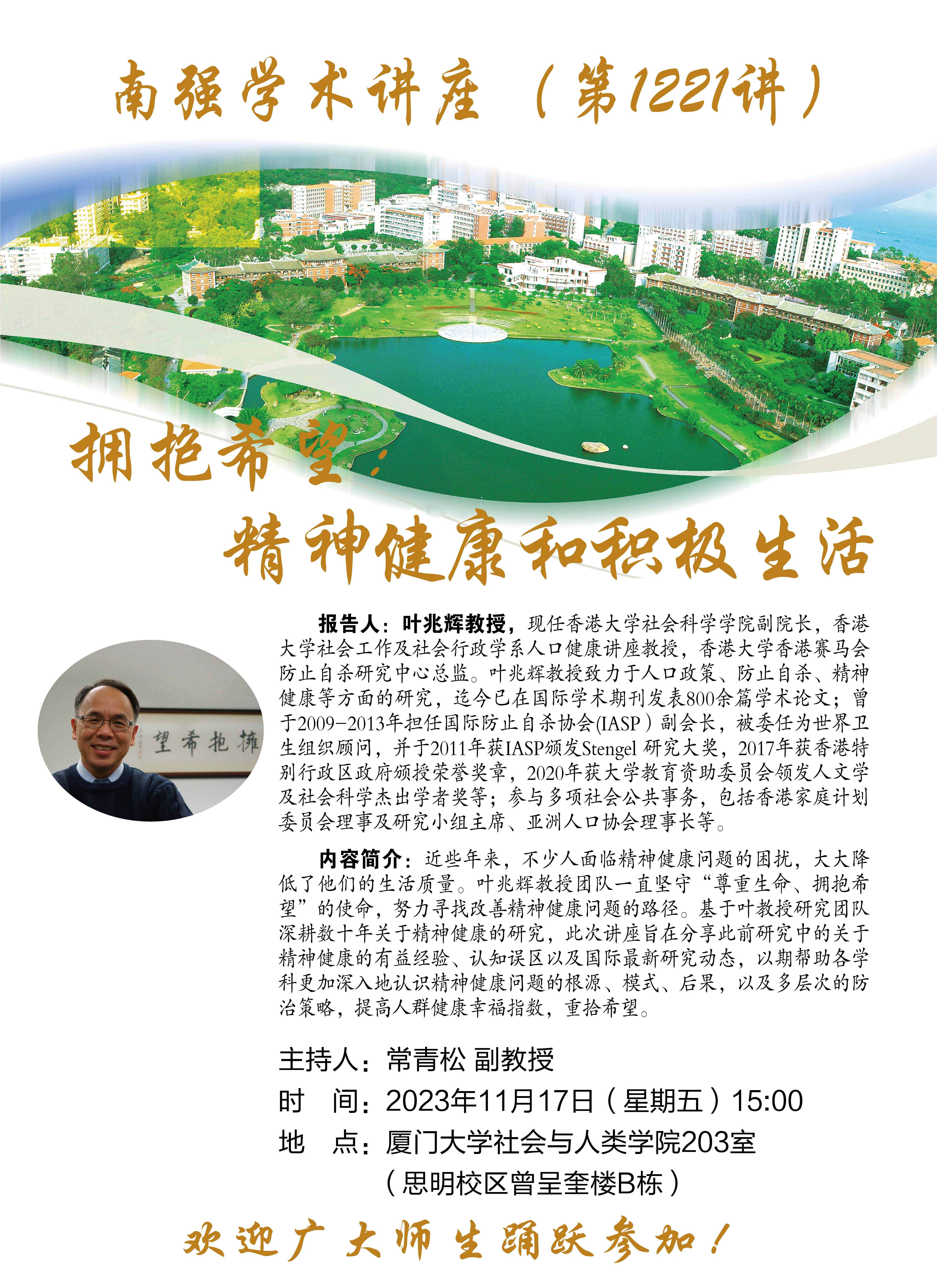 报告人:叶兆辉教授,现任香港大学社会科学学院副院长,香港大学社会工作及社会行政学系人口健康讲座教授,香港大学香港赛马会防止自杀研究中心总监。叶兆辉教授致力于人口政策、防止自杀、精神健康等方面的研究,迄今已在国际学术期刊发表800余篇学术论文;曾于2009-2013年担任国际防止自杀协会(IASP)副会长,被委任为世界卫生组织顾问,并于2011年获IASP颁发Stengel 研究大奖,2017年获香港特别行政区政府颁授荣誉奖章,2020年获大学教育资助委员会领发人文学及社会科学杰出学者奖等;参与多项社会公共事务,包括香港家庭计划委员会理事及研究小组主席、亚洲人口协会理事长等。