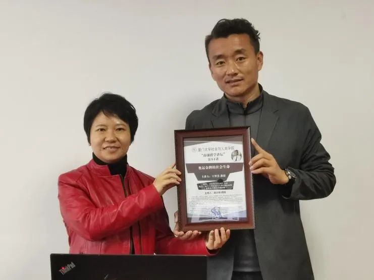 在互动环节,同学们积极踊跃提问,王智慧教授围绕着“运动社会学的意涵” “夺金运动员塑造自我的技术”“个体运动行为志研究范式的应用”“如何研究体育运动和观赛中重要的情感因素”等问题与同学们深入探讨,在耐心予以精彩回答的同时,王智慧教授还分享了选题的方法,鼓励同学们从困惑中寻找研究问题,再将问题进一步拆解,与理论建立关联。在体育强国建设的背景下,王智慧教授的研究成果具有很强现实意义和学术价值。讲座最后,厦门大学社会与人类学院龚文娟教授代表学院向王智慧教授颁赠南强群学讲座纪念牌,本次讲座在现场热烈的掌声中圆满结束。