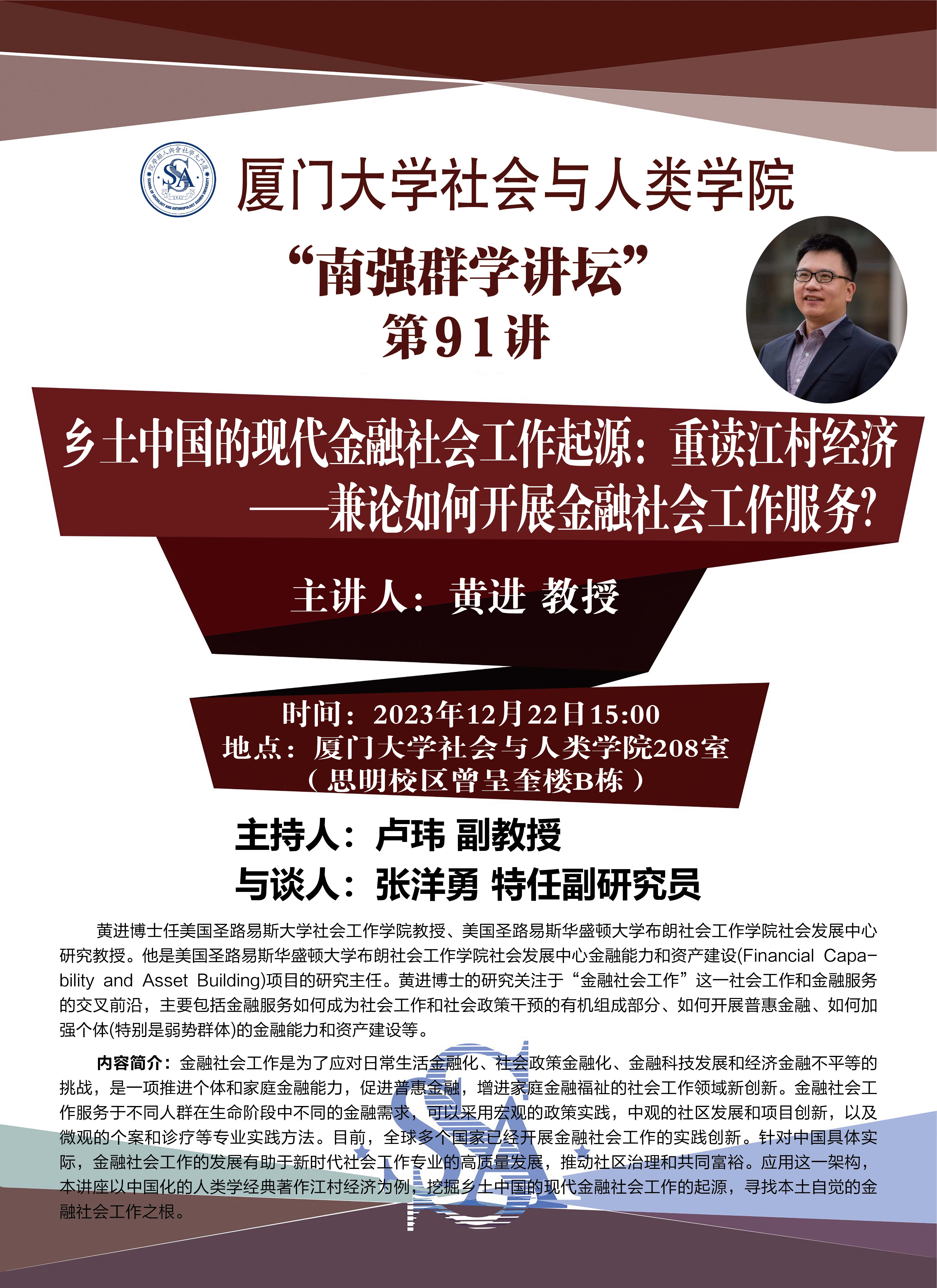 主讲人简介:黄进博士任美国圣路易斯大学社会工作学院教授、美国圣路易斯华盛顿大学布朗社会工作学院社会发展中心研究教授。他是美国圣路易斯华盛顿大学布朗社会工作学院社会发展中心金融能力和资产建设(Financial Capability and Asset Building)项目的研究主任。黄进博士的研究关注于“金融社会工作”这一社会工作和金融服务的交叉前沿,主要包括金融服务如何成为社会工作和社会政策干预的有机组成部分、如何开展普惠金融、如何加强个体(特别是弱势群体)的金融能力和资产建设等。