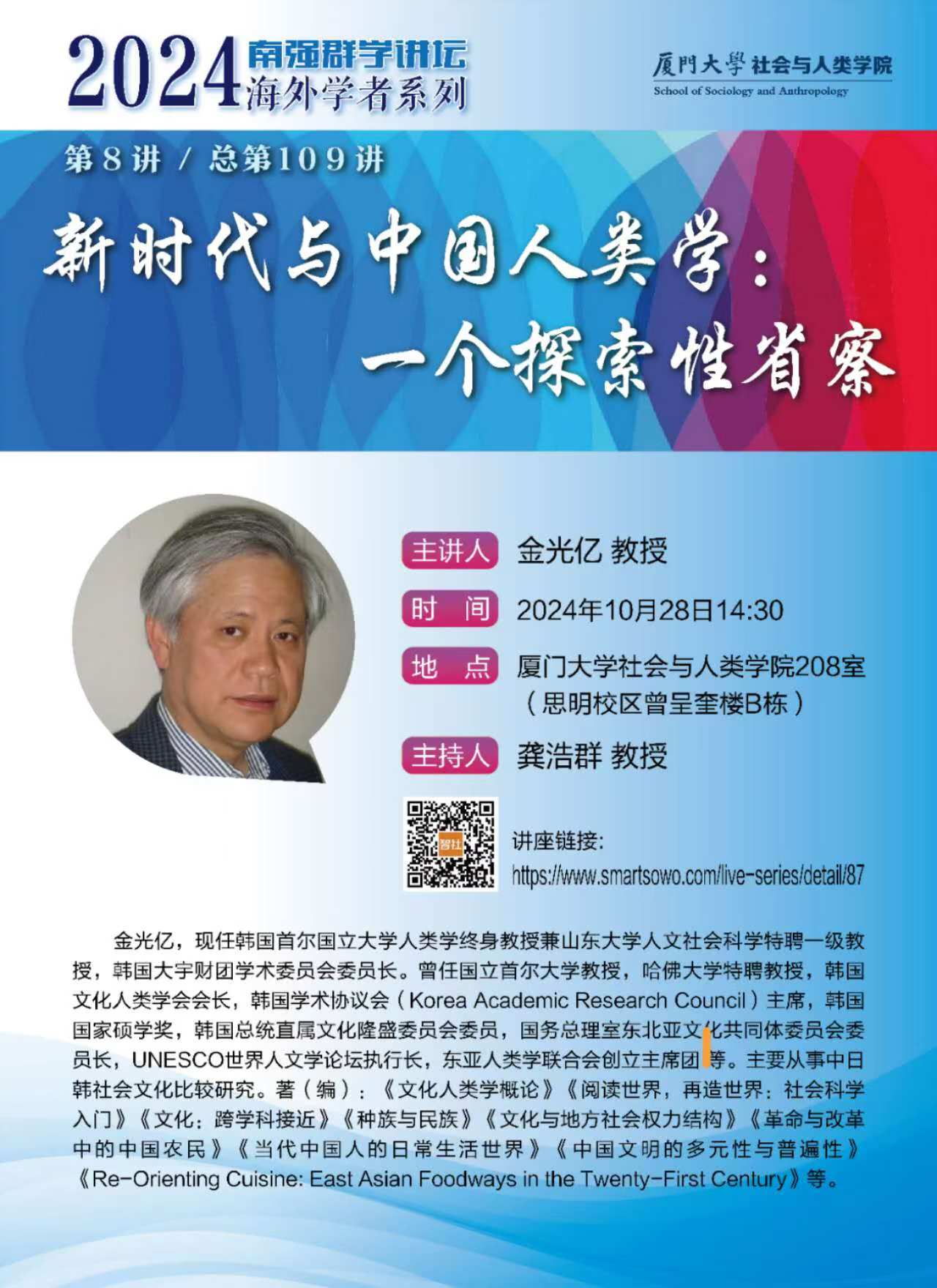 主讲人简介:金光亿,现任韩国首尔国立大学人类学终身教授兼山东大学人文社会科学特聘一级教授,韩国大宇财团学术委员会委员长。曾任国立首尔大学教授,哈佛大学特聘教授,韩国文化人类学会会长,韩国学术协议会(Korea Academic Research Council)主席,韩臣国家硕学奖,韩国总统直属文化隆盛委员会委员,国务总理室东北亚文化共同体委员会委员长,UNESCO世界人文学论坛执行长,东亚人类学联合会创立主席团等。主要从事中日韩社会文化比较研究。著(编):《文化人类学概论》《阅读世界,再造世界:社会科学入门》《文化:跨学科接近》《种族与民族》《文化与地方社会权力结构》《革命与改革中的中国农民》《当代中国人的日常生活世界》《中国文明的多元性与普遍性》《Re-Orienting Cuisine: East Asian Foodways in the Twenty-First Century》等。