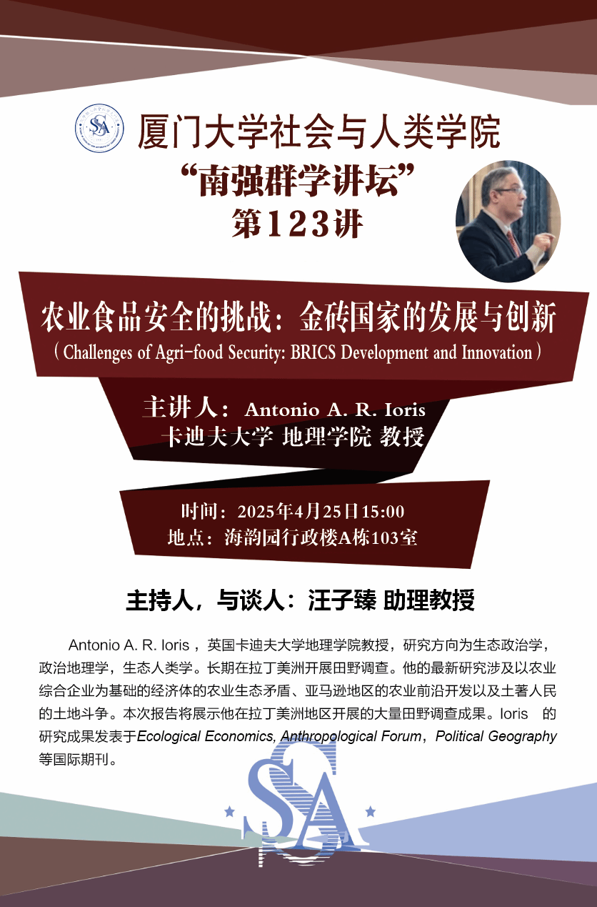 Antonio A. R. Ioris, 英国卡迪夫大学地理学院教授,研究方向为生态政治学,政治地理学,生态人类学。长期在拉丁美洲开展田野调查。他的最新研究涉及以农业综合企业为基础的经济体的农业生态矛盾、亚马逊地区的农业前沿开发以及土著人民的土地斗争。本次报告将展示他在拉丁美洲地区开展的大量田野调查成果。Ioris的研究成果发表于Ecological Economics, Anthropological Forum, Political Geography等国际期刊。