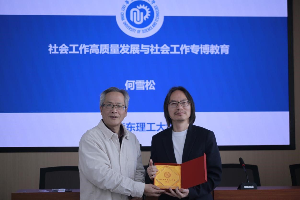 本次讲座中,童敏教授为何雪松教授颁发“厦门大学人文社科至善大讲堂”纪念牌。