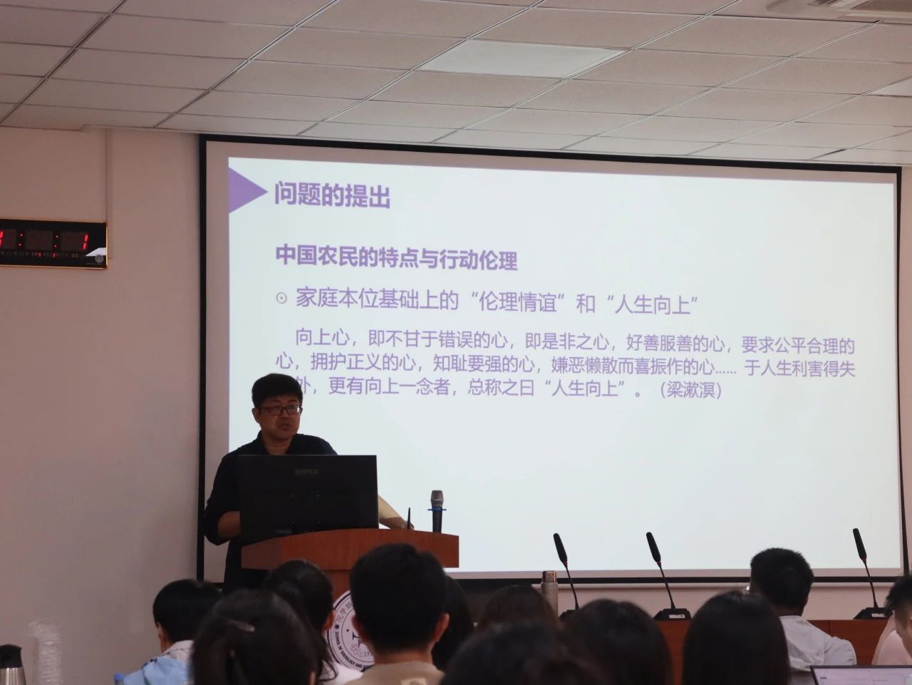 讲座伊始,周教授从中国农民行动的核心——家庭本位讲起,指出其背后蕴含的“伦理情谊”与“人生向上”的文化要义,并阐述了目前农民研究的被动化、功利化、个体化取向。由此,他提出“家庭档案法”,通过对云南弥渡、江苏江阴两地家庭的多次回访,揭示了经济条件、社会关系与家庭伦理责任的复杂关联。