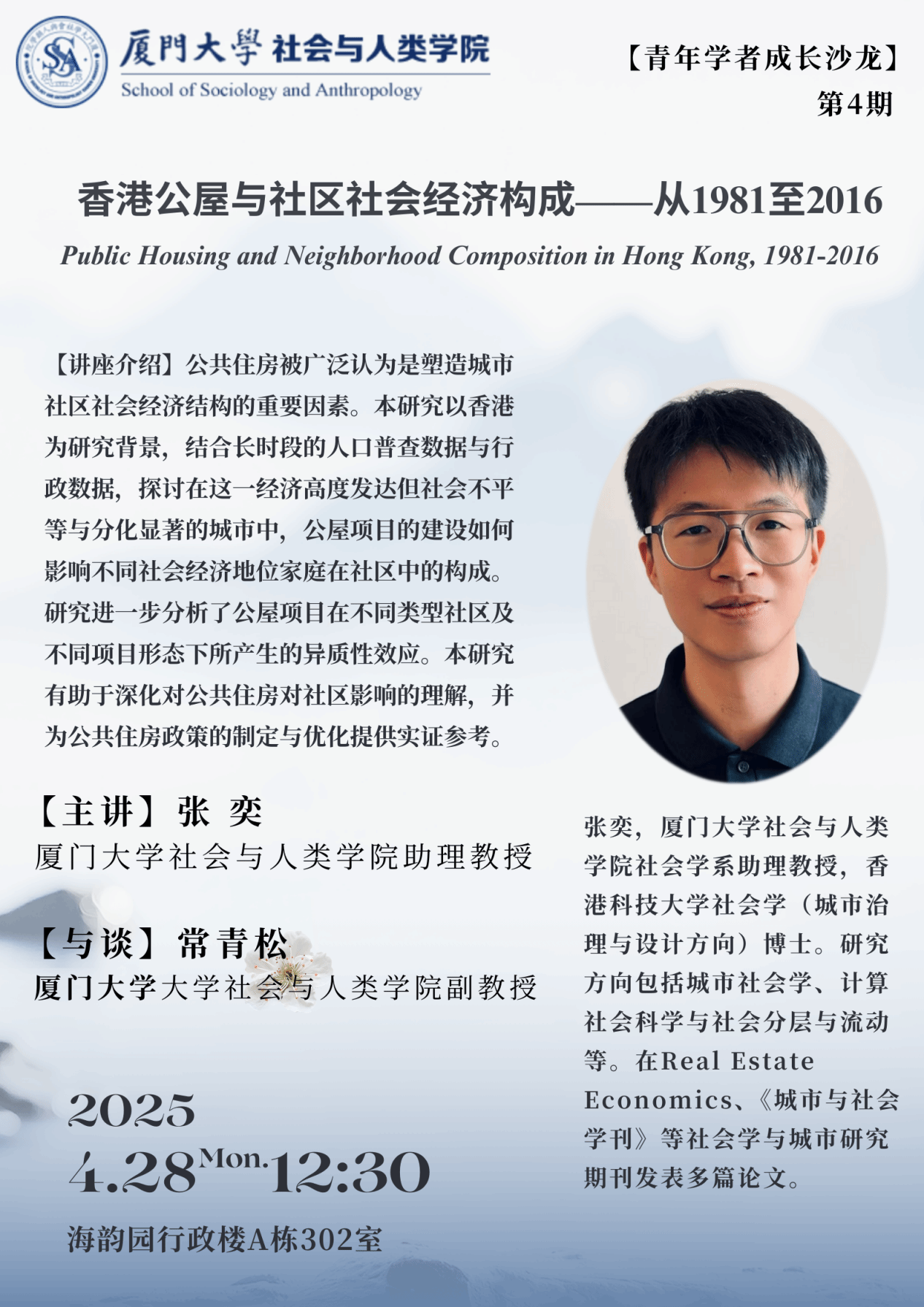 主讲人:张奕,厦门大学社会与人类学院社会学系助理教授,香港科技大学社会学(城市治理与设计方向)博士。研究方向包括城市社会学、计算社会科学与社会分层与流动等。在Chinese Sociological Review、Real Estate Economics、《城市与社会学刊》等社会学与城市研究期刊发表多篇论文。