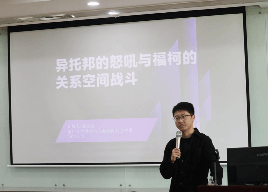 2025年4月14日中午,厦门大学社会与人类学院青年学者成长沙龙系列讲座第三期在海韵园行政楼A栋302室举行。本次讲座的主讲人为社会与人类学院富永选助理教授,分享主题为“异托邦的怒吼与福柯的关系空间战斗”,刘子曦教授主持活动,来自哈尔滨工程大学的吴肃然教授参与对谈,学院院长邓燕华教授等参与点评交流。