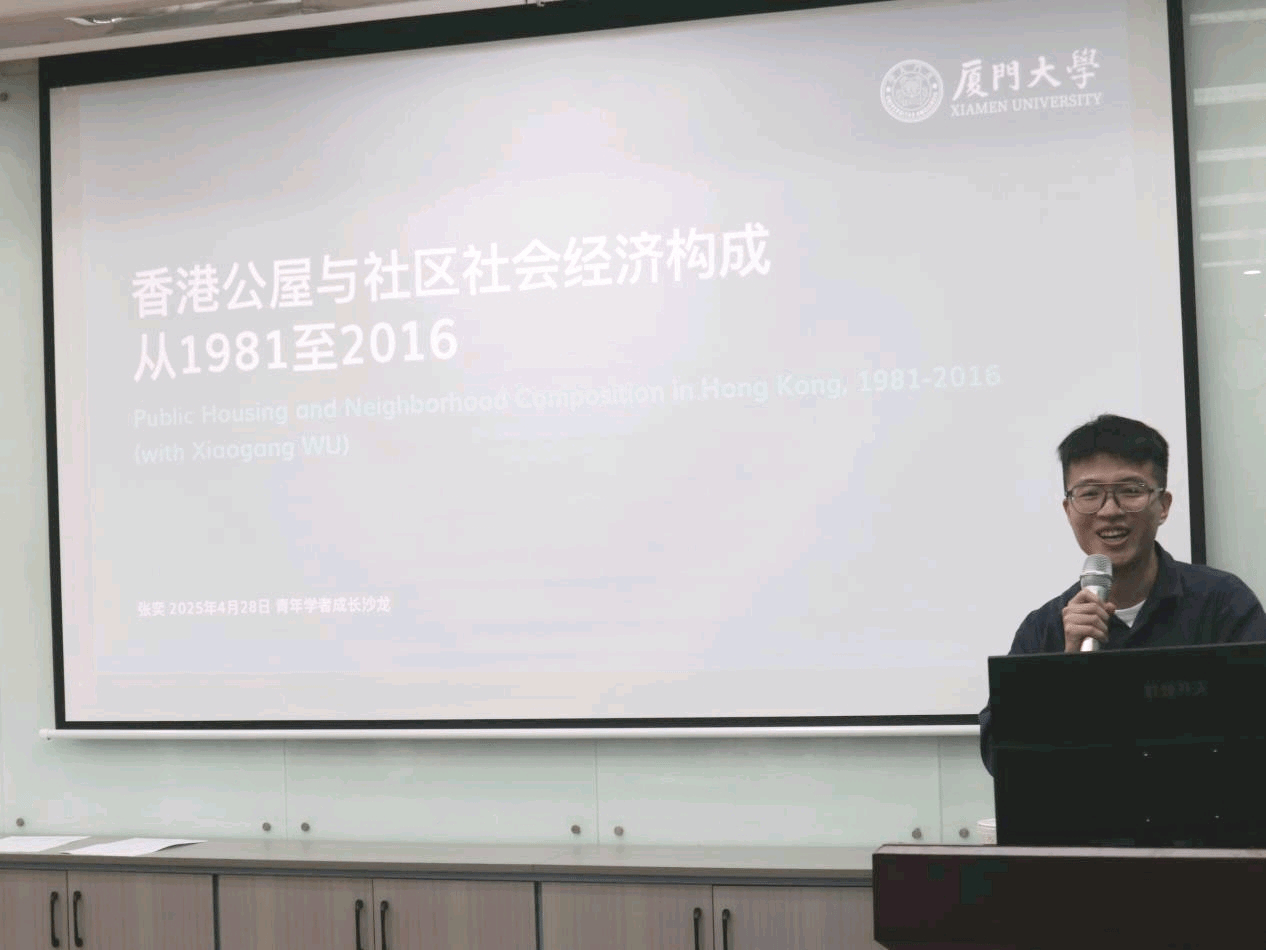 2025年4月28日中午,厦门大学社会与人类学院青年学者成长沙龙系列讲座第四期在海韵园行政楼A栋302室举行。本次讲座的主讲人为社会与人类学院张奕助理教授,分享主题为“香港公屋与社区社会经济构成(1981-2016)”,陈福平教授主持活动,社会学系常青松副教授参与对谈,学院院长邓燕华教授、副院长徐延辉教授、社会工作系卢玮副教授等老师参与点评交流。