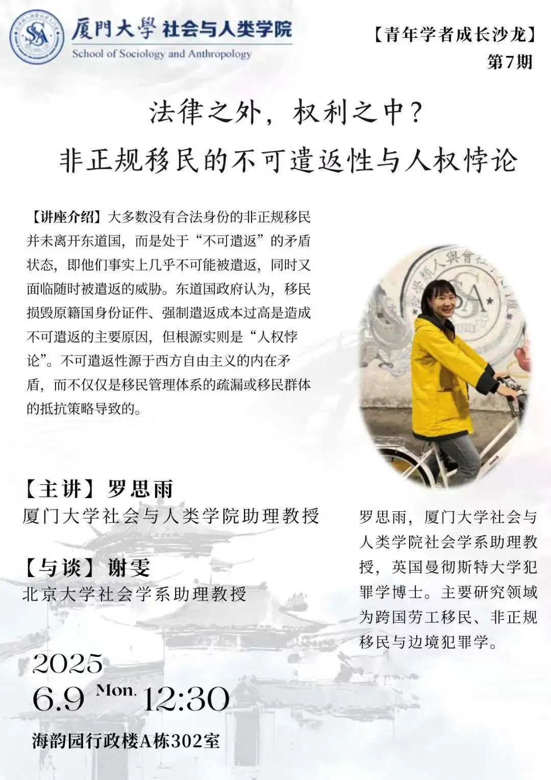 主讲人:罗思雨,厦门大学社会与人类学院社会学系助理教授,英国曼彻斯特大学犯罪学博士。主要研究领域为跨国劳工移民、非正规移民与边境犯罪学。