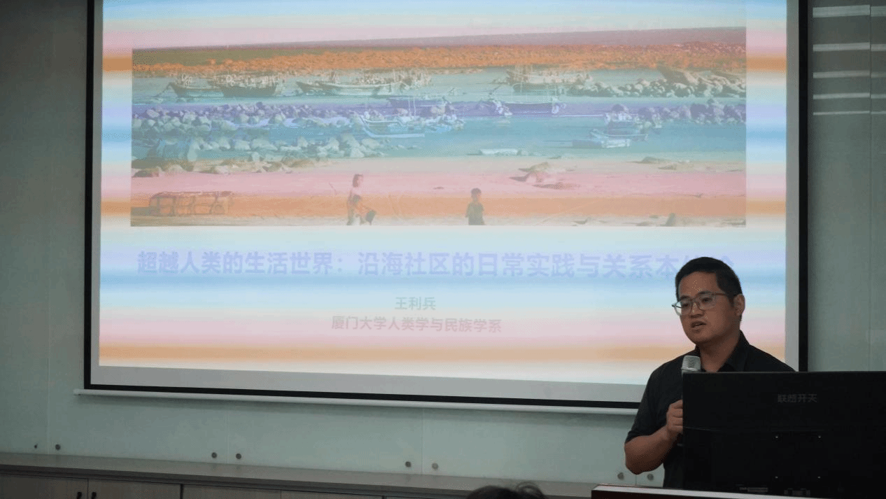 2025年5月26日中午,厦门大学社会与人类学院青年学者成长沙龙系列讲座第六期在海韵园行政楼A栋302室举行。本次讲座的主讲人为社会与人类学院王利兵副教授,分享主题为“超越人类的生活世界:海岸带的日常实践与关系本体论”,李晋副教授主持活动,人类学与民族学系主任龚浩群教授参与对谈,学院院长邓燕华教授、人类学与民族学系葛荣玲副教授、社会工作系卢玮副教授等老师参与点评交流,同时本次讲座吸引到了华侨大学、厦门理工学院等其他学校的老师参加。