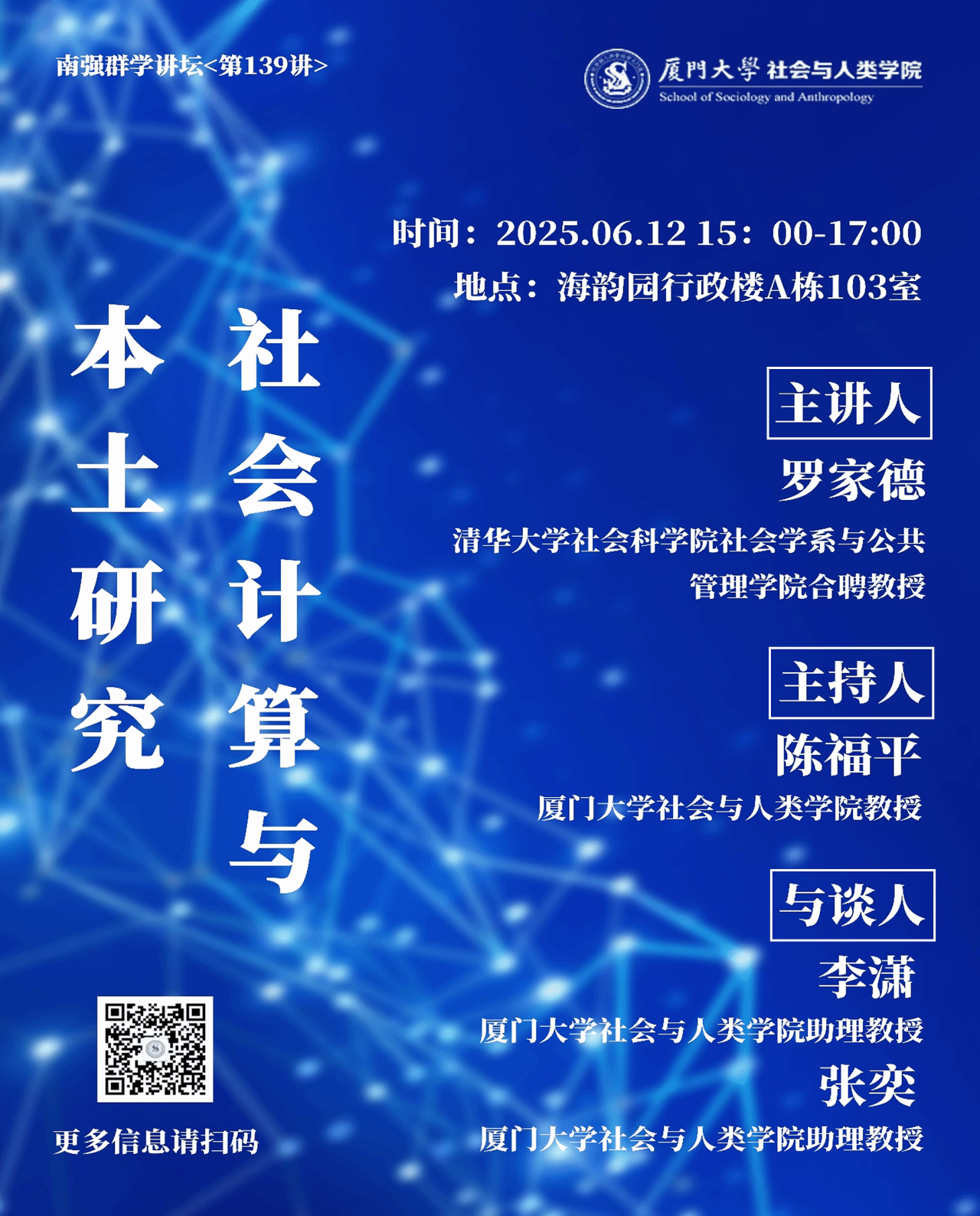 罗家德是清华大学社会科学院社会学系与公共管理学院合聘教授、博导,清华大学计算社会科学与国家治理实验室社会学组PI,为Journal of Social Computing主编,中国社会学会社会网暨社会资本研究专业委员会创会主席。在学术领域着重于社会网理论、复杂社会系统研究,社会计算、大数据中的社会网分析,自组织过程研究等。同时还组织了社区营造研究中心在汶川地震灾区乡村、北京大栅栏、以及成都地区从事智能化基层治理的社区实验。