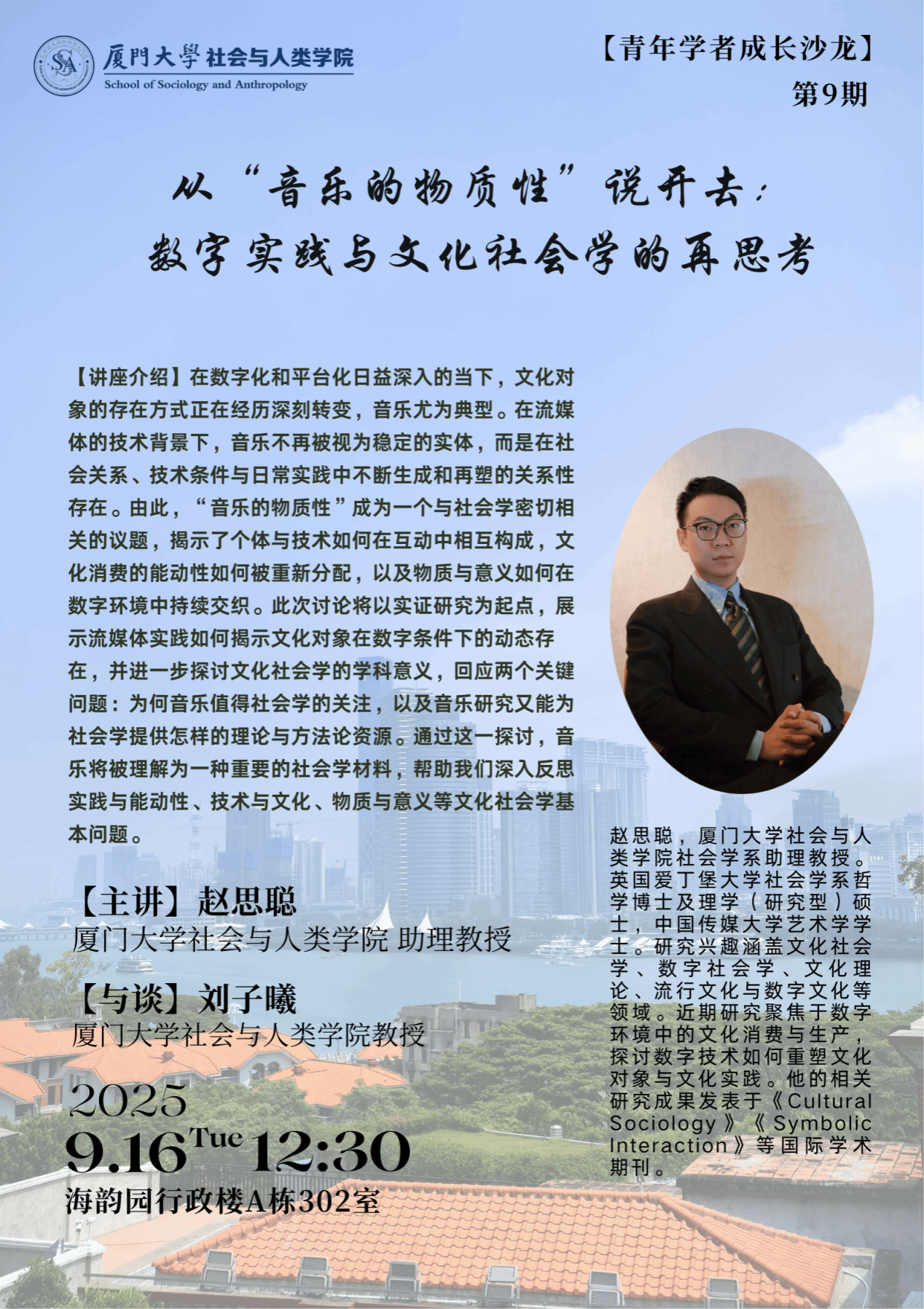 主讲人:赵思聪,厦门大学社会与人类学院社会学系助理教授。英国爱丁堡大学社会学系哲学博士及理学(研究型)硕士,中国传媒大学艺术学学士。研究兴趣涵盖文化社会学、数字社会学、文化理论、流行文化与数字文化等领域。近期研究聚焦于数字环境中的文化消费与生产,探讨数字技术如何重塑文化对象与文化实践。他的相关研究成果发表于《Cultural Sociology》《Symbolic Interaction》等国际学术期刊。