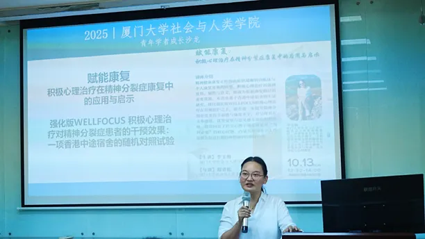 2025年10月13日中午,厦门大学社会与人类学院青年学者成长沙龙系列讲座第十一期在海韵园行政楼A栋302室举行。本次讲座的主讲人为社会与人类学院李玉梅助理教授,分享主题为“赋能康复:积极心理治疗在精神分裂症康复中的应用与启示”。人类学与民族学系徐榕榕助理教授主持活动,社会学系常青松副教授参与对谈,社会与人类学院邓燕华教授、徐延辉教授、杨凌燕副教授与汪子臻助理教授等师生现场参与提问交流。本次讲座吸引了约70名来自不同院系与学科背景的师生报名参与。