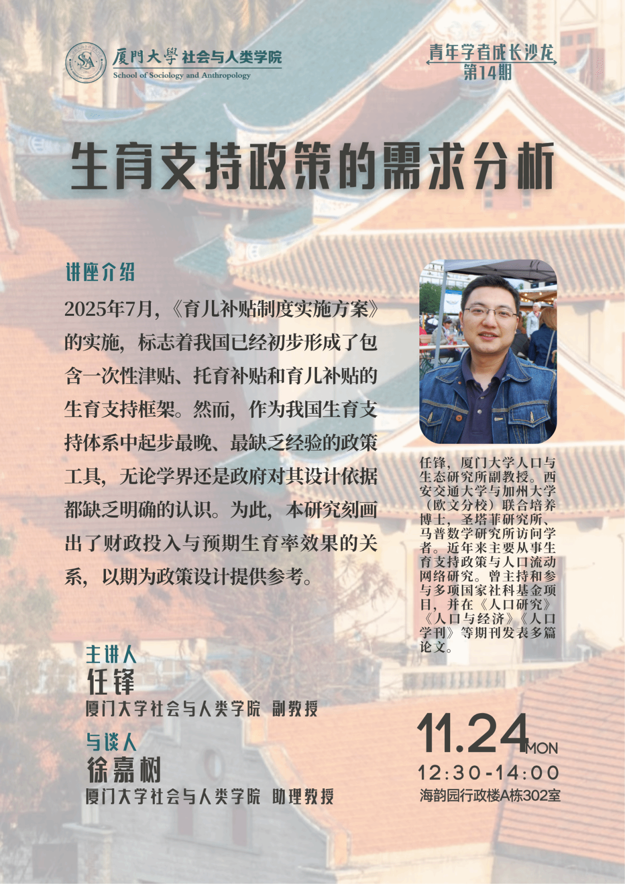 主讲人:任锋,厦门大学人口与生态研究所副教授,西安交通大学与加州大学(欧文分校)联合培养博士,圣塔菲研究所、马普数学研究所访问学者。近年来主要从事生育支持政策与人口流动网络研究。曾主持和参与多项国家社科基金项目,并在《人口研究》《人口与经济》《人口学刊》等期刊发表多篇论文。