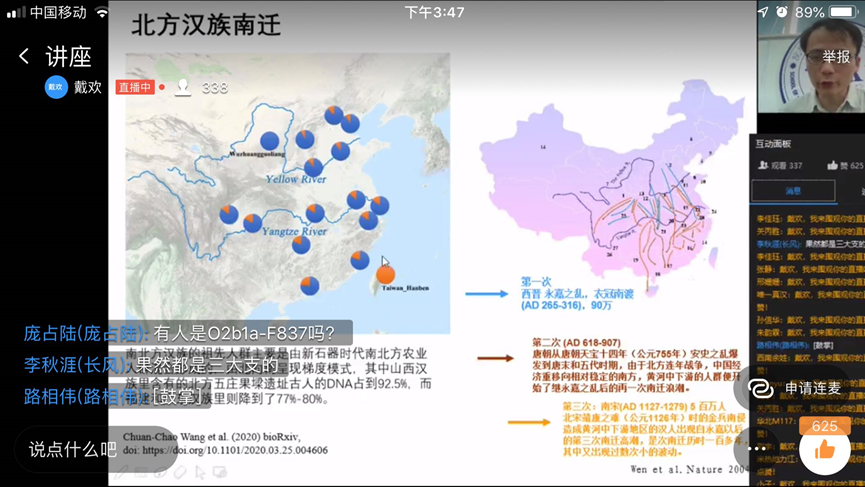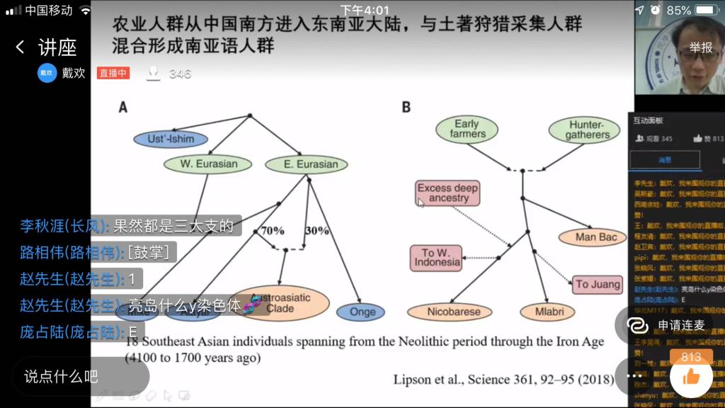 2020年4月27日下午,我院人类学研究所所长王传超教授以“古DNA解析东亚人群8000年来的迁徙和混合历史”为题开展了一次“云讲座”。本次线上讲座由社会学系易林教授邀请、人类学与民族学系张亚辉教授主持,有校内外300余名师生和分子人类学爱好者参加。