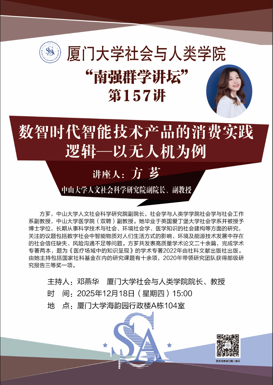 方芗,中山大学人文社会科学研究院副院长,社会学与人类学学院社会学与社会工作系副教授,中山大学医学院(双聘)副教授。她毕业于英国爱丁堡大学社会学系并被授予博士学位,长期从事科学技术与社会、环境社会学、医学知识的社会建构等方面的研究,关注的议题包括数字社会中智能物质对人们生活方式的影响、环境及能源技术发展中存在的社会信任缺失、风险沟通不足等问题。方芗共发表高质量学术论文二十余篇,完成学术专著两本,题为《医疗场域中的知识呈现》的学术专著2022年由社科文献出版社出版。由她主持包括国家社科基金在内的研究课题有十余项,2020年带领研究团队获得部级研究报告三等奖一项。
