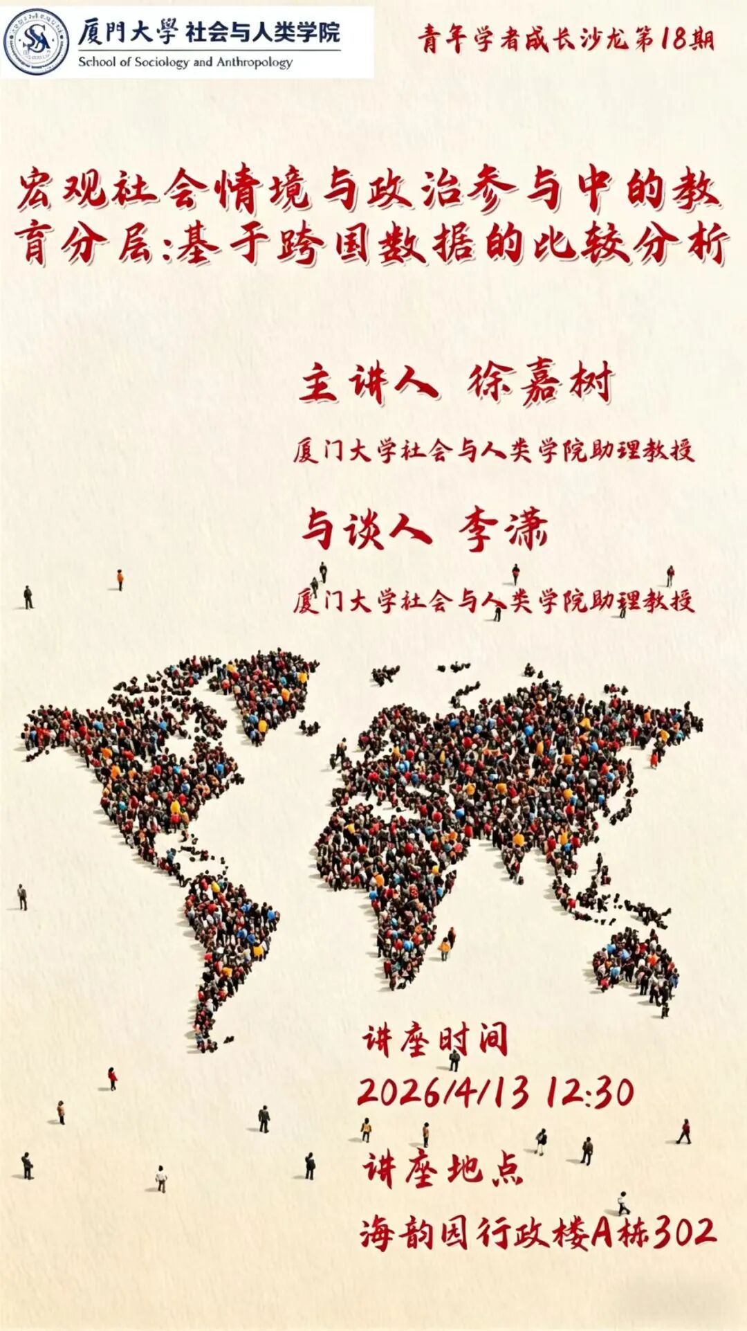 主讲人:徐嘉树,厦门大学社会与人类学院助理教授,中国人民大学社会学博士,主要研究方向为家庭社会学、人口社会学等,研究成果发表在《Research in Social Stratification and Mobility》《Chinese Journal of Sociology》等期刊。