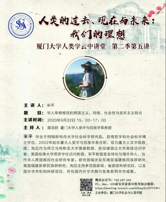 毕业于阿姆斯特丹大学社会科学研究院,获得哲学和社会科学博士学位,2002年起在厦大人类学与民族学系任职,现为厦大人文学院教授。先后担任荷兰乌特勒支大学客座教授,新加坡国立大学高级访问学者,美国哈佛大学燕京学社访问教授。宋平教授是全球化与海外华人、当代华人跨国移民社会研究专家。研究领域涉及东南亚福建移民族群研究、美国福建新移民族群研究,先后主持多项国家级、省部级科研项目,以及国外学术机构科研项目,并在国内外学术期刊发表系列学术成果。
