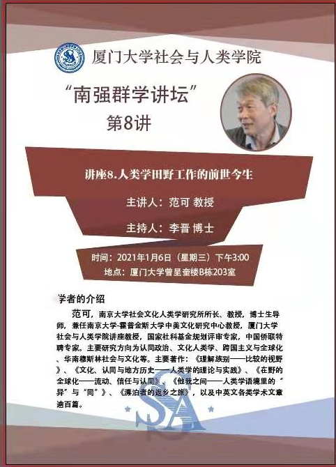 范可,南京大学社会文化人类学研究所所长、教授,博士生导师,兼任南京大学-霍普金斯大学中美文化研究中心教授,厦门大学社会与人类学院讲座教授,国家社科基金规划评审专家,中国侨联特聘专家。主要研究方向为认同政治、文化人类学、跨国主义与全球化、华南穆斯林社会与文化等。主要著作:《理解族别——比较的视野》、《文化、认同与地方历史——人类学的理论与实践》、《在野的全球化——流动、信任与认同》、《他我之间——人类学语境里的“异”与“同”》、《漂泊者的返乡之旅》,以及中英文各类学术文章逾百篇。