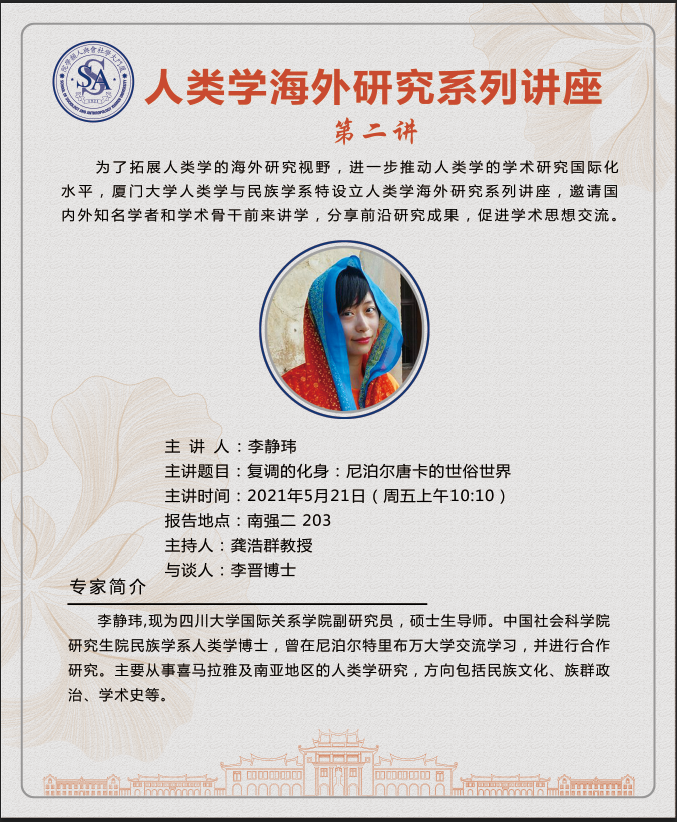 主讲人简介:李静玮:现为四川大学国际关系学院副研究员,硕士生导师。中国社会科学院研究生院民族学系人类学博士,曾在尼泊尔特里布万大学交流学习,并进行合作研究。主要从事喜马拉雅及南亚地区的人类学研究,方向包括民族文化、族群政治、学术史等。