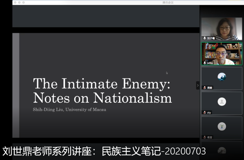 2020年7月3日上午,澳门大学社会科学学院传播系副系主任刘世鼎教授,在厦门大学社会与人类学院“情绪与公共文化”系列讲座中发表了第二讲题为《亲密的敌人:民族主义笔记》的线上学术演讲,主要从动力、主体化以及历史经验三个方面来剖析民族主义这个颇受关注却非常复杂的社会现象。