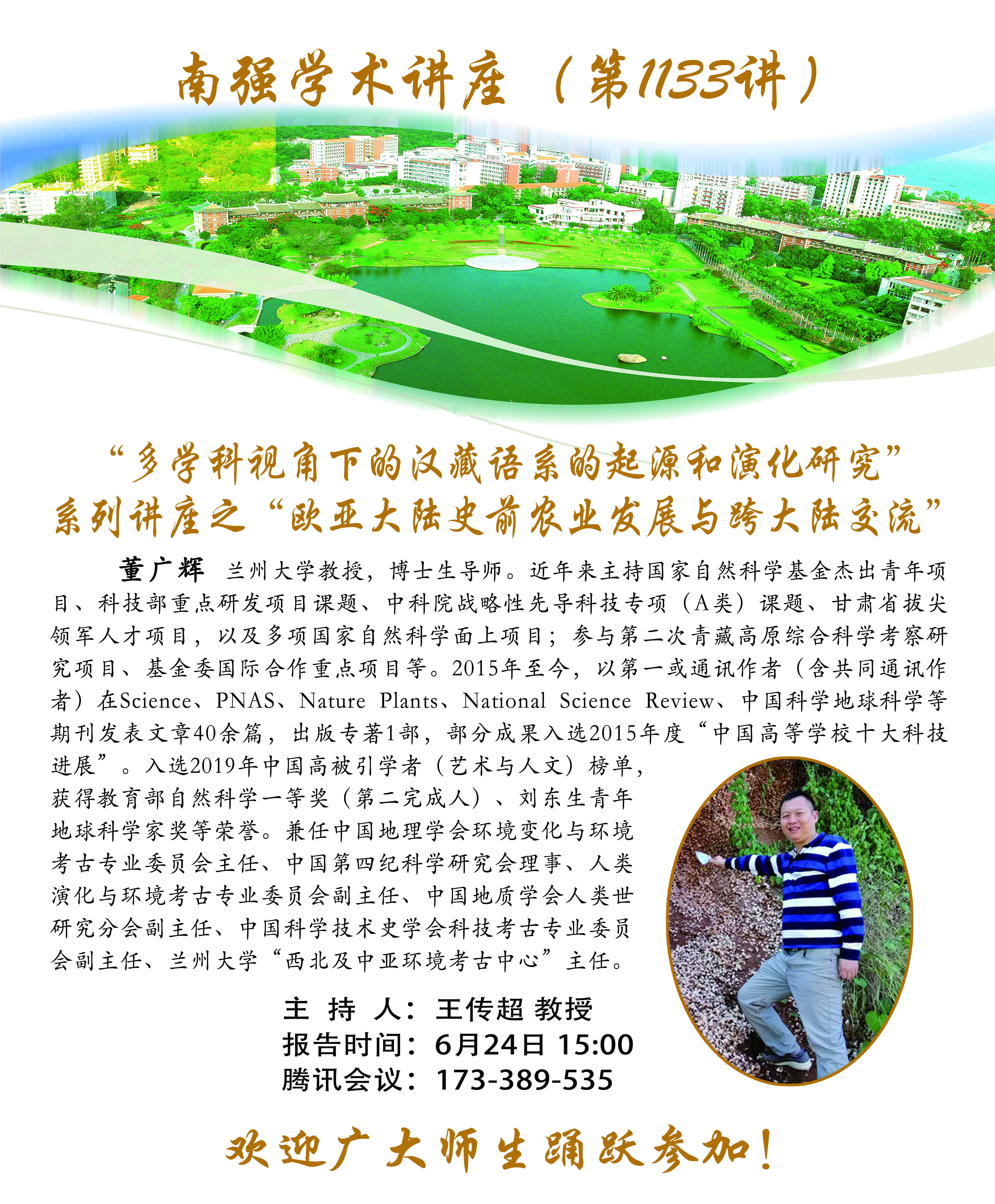 董广辉,兰州大学教授,博士生导师。近年来主持国家自然科学基金杰出青年项目、科技部重点研发项目课题、中科院战略性先导科技专项(A类)课题、甘肃省拔尖领军人才项目,以及多项国家自然科学面上项目;参与第二次青藏高原综合科学考察研究项目、基金委国际合作重点项目等。2015年至今,以第一或通讯作者(含共同通讯作者)在Science、PNAS、Nature Plants、National Science Review、中国科学地球科学等期刊发表文章40余篇,出版专著1部,部分成果入选2015年度“中国高等学校十大科技进展”。入选2019年中国高被引学者(艺术与人文)榜单,获得教育部自然科学一等奖(第二完成人)、刘东生青年地球科学家奖等荣誉。兼任中国地理学会环境变化与环境考古专业委员会主任、中国第四纪科学研究会理事、人类演化与环境考古专业委员会副主任、中国地质学会人类世研究分会副主任、中国科学技术史学会科技考古专业委员会副主任、兰州大学“西北及中亚环境考古中心”主任。