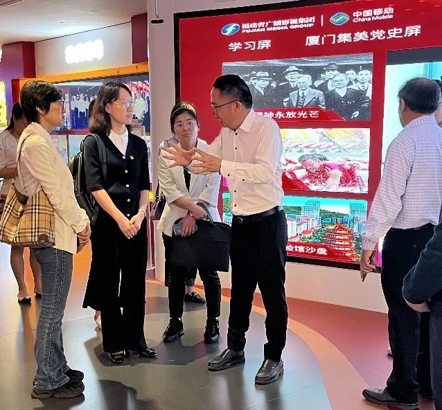 在集美人文馆,集美区文旅局局长吴吉堂介绍到,集美人文馆作为新城开发建设十周年重点项目,包含了集美人文简史厅、嘉庚精神展示厅、华侨文化展示厅、学村文化展示厅和5G+AR党史馆,兼具集美文化的历史风华与城市建设的现代追求。在闽台记忆馆,闽台关系档案文献展则以“闽台两地建设共同家园、两岸人民留存共同记忆”为主题,再现了自明清以来闽台间的真实历史风貌,以及延续至今的两岸融合发展历程。师生们边走边学,不仅领略集美的历史人文,重温嘉庚精神,同时也上了一堂生动且深刻的党史学习课。