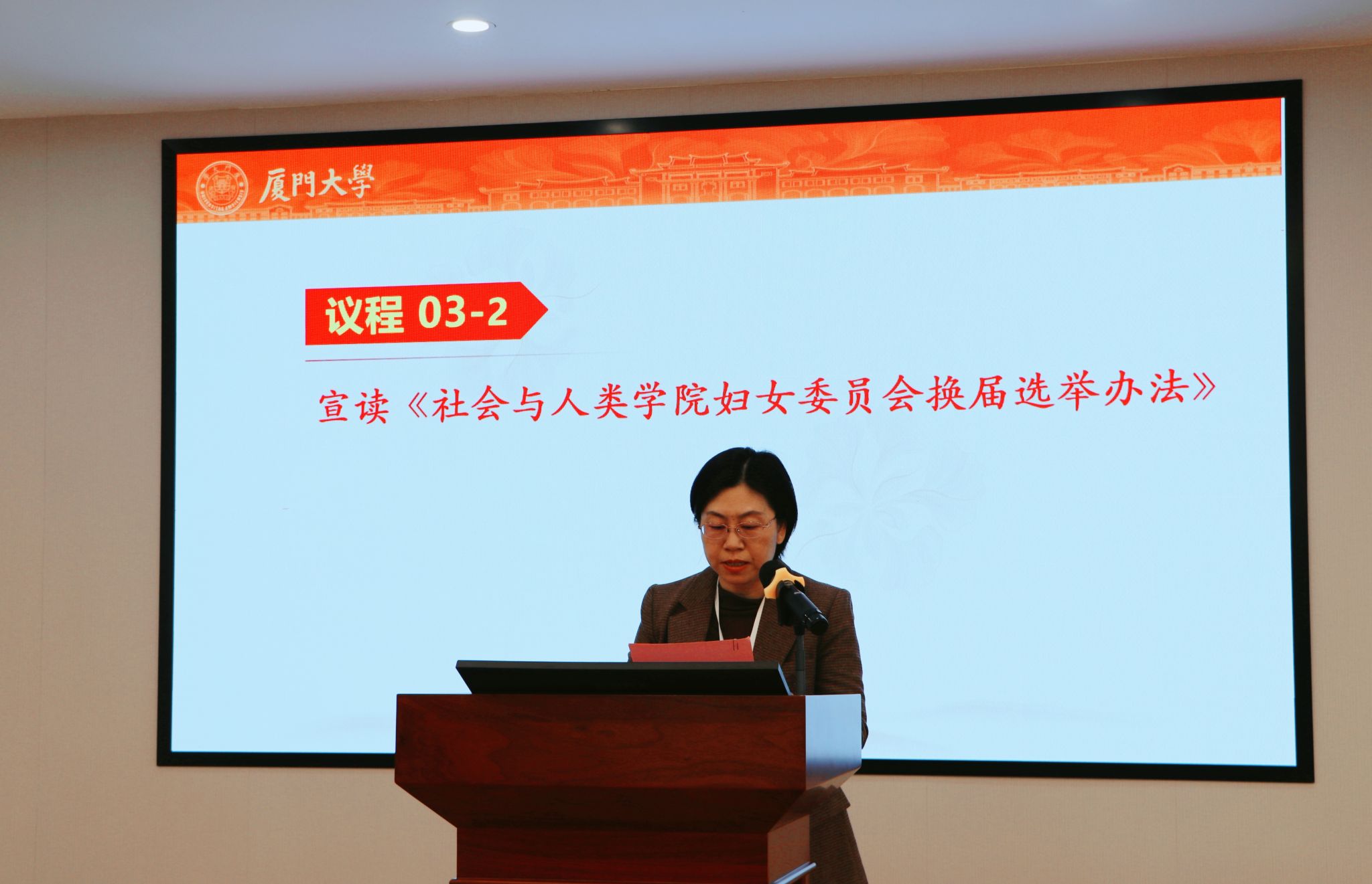 陈夷宣读学校《关于社会与人类学院妇女委员会委员、主任候选人预备人选的批复》。会议审议通过了大会选举办法和监票人、计票人名单。随后,大会按照程序规定,以无记名投票、差额选举方式选举产生社会与人类学院新一届妇女委员会委员,分别是(按姓氏笔画为序):李潇、郑思明、葛荣玲、赖婷婷 、詹秀娇(学生)。