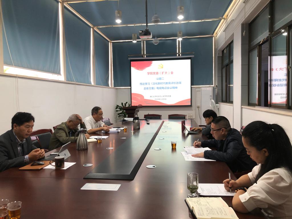 会议还传达了教育部《深化新时代教育评价改革总体方案》电视电话会议精神。谢银辉强调,全院要充分认识总体方案的重要指导意义,要深刻学习领会习近平总书记关于教育评价的重要论述精神,深刻领会“为什么改”“改什么”“怎么改”,增强责任感、使命感和紧迫感,下一步要根据学校的工作部署,结合学院实际,开展新时代教育评价改革相关工作。