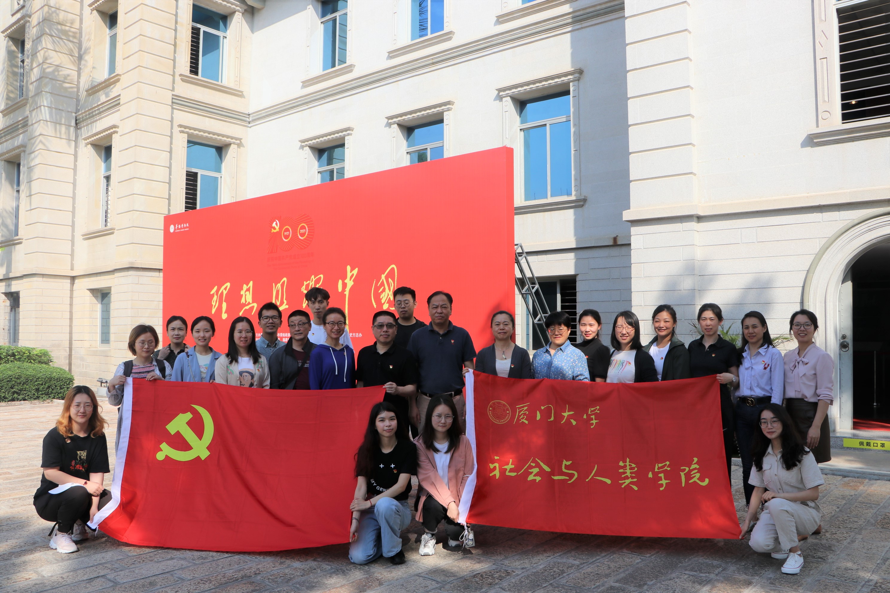 华侨博物院是由校主陈嘉庚先生于1956年倡办,1959年落成开放,是我院学生的一个重要实习实践基地。在讲解员的生动解说下,师生党员参观了“理想照耀中国——庆祝中国共产党成立100周年主题展”,在翔实的历史图文、展出文物中重温中国共产党走过的伟大革命历程,体悟百年党史上从红船精神到脱贫攻坚精神等三十余种组成的精神谱系。