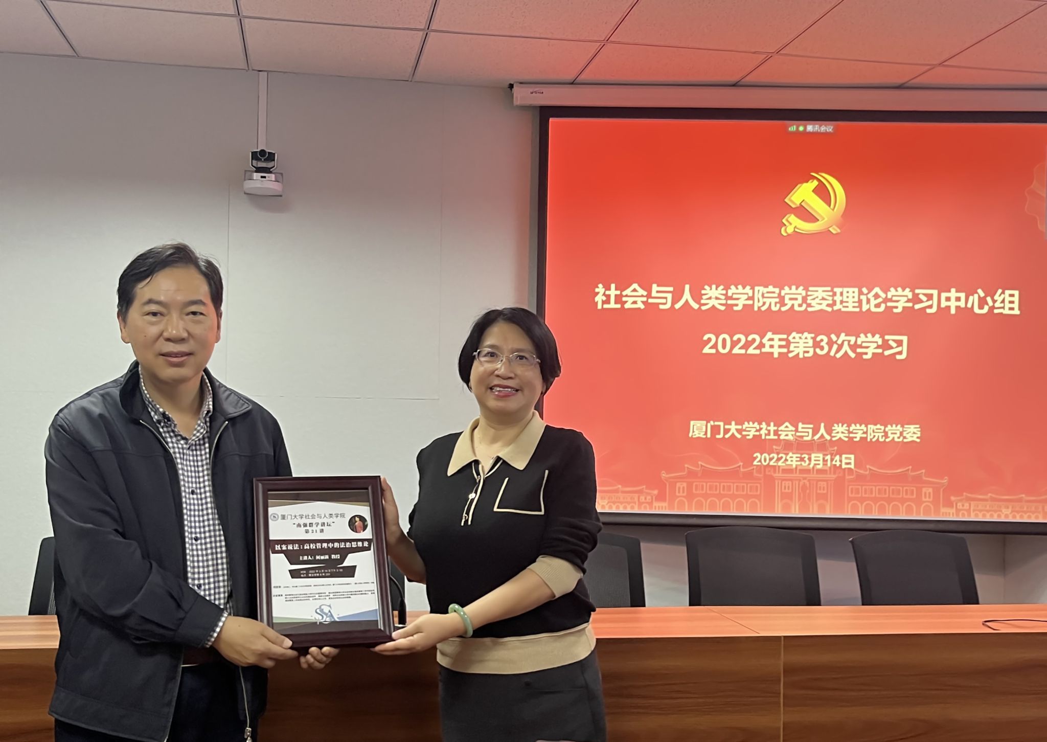 学习会上,学院院长胡荣教授为何丽新教授颁发学院南强群学讲坛纪念牌。