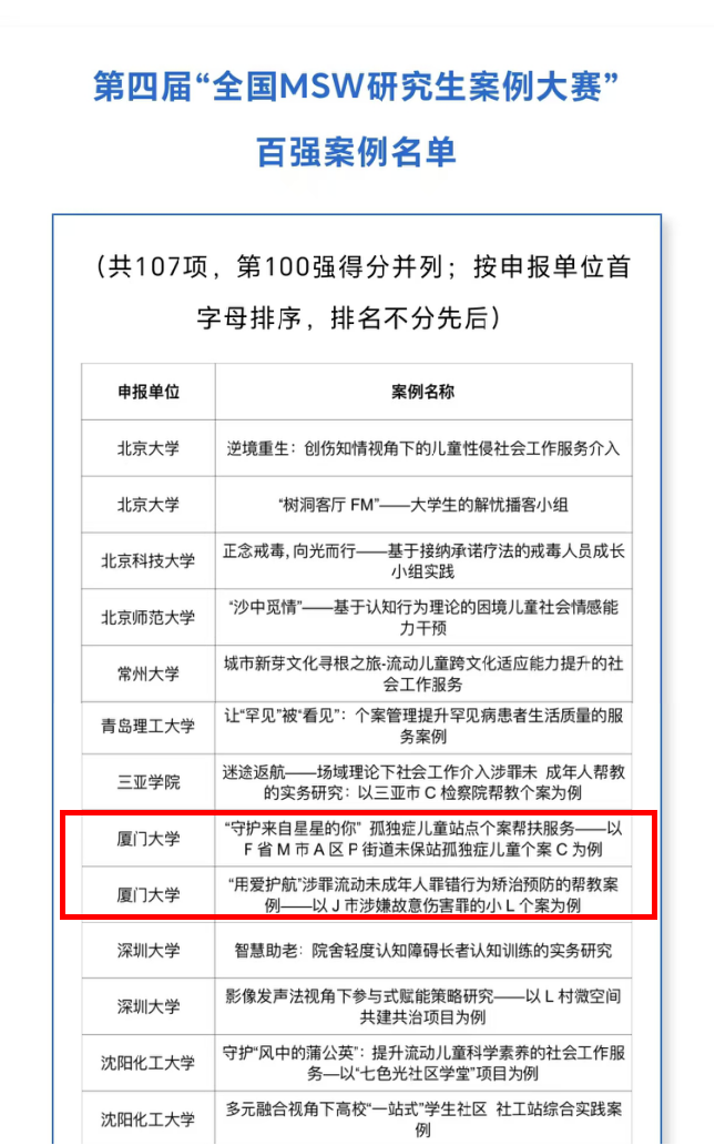 全国MSW研究生案例大赛是由社会工作专业学位研究生教育指导委员会指导、社会工作专业学位研究生教育院校联席会议主办的全国相关领域最高水平的赛事之一。本届赛事中,来自北京大学、中国人民大学、复旦大学、厦门大学、西安交通大学等全国168所MSW研究生培养单位的422篇参赛案例进入初赛通讯评审。经过匿名评审,评选出百强案例。前四十强案例受邀进入决赛,通过案例展示和现场答辩确定最终排名。