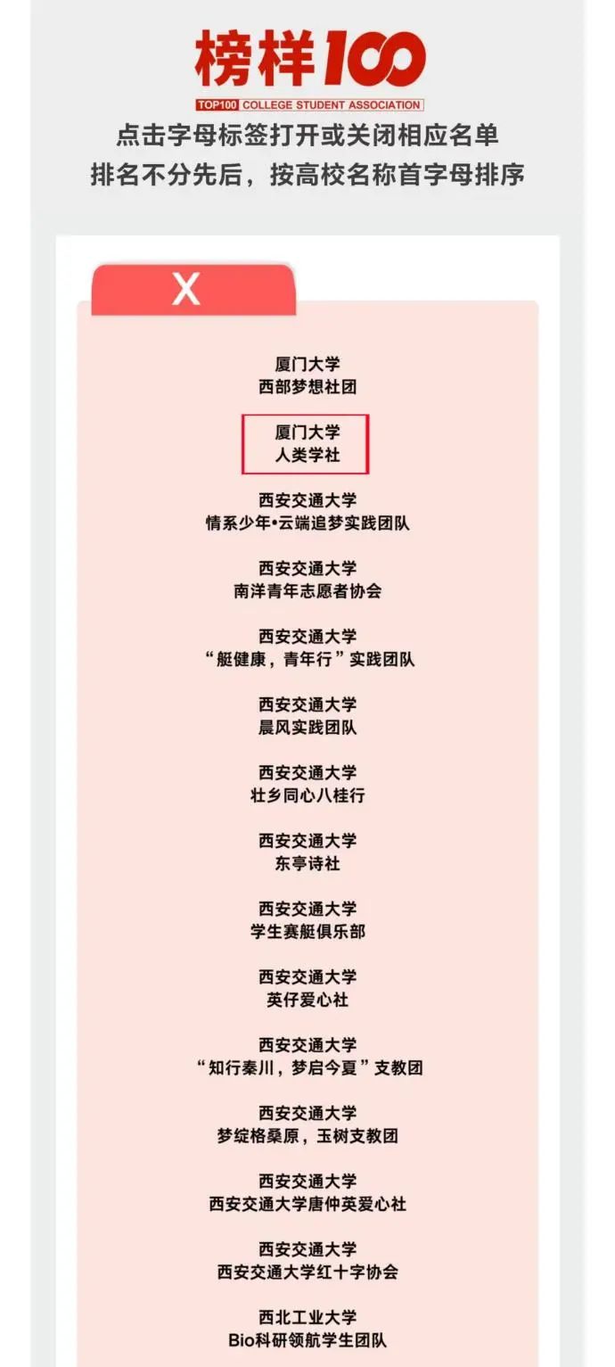 本年度厦门大学人类学社再次荣登“榜样100|全国优秀大学生社团及团队”榜单。