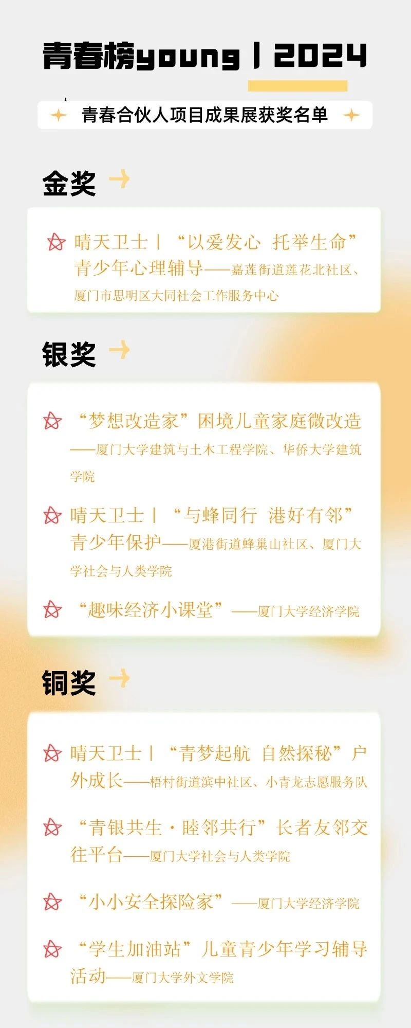 2024年12月29日,为深入贯彻落实《关于健全新时代志愿服务体系的意见》文件精神,由厦门团市委指导,思明团区委、思明区委社会工作部、思明区委文明办主办,思明区青少年权益中心、启福社工承办的青春榜YOUNG|2024青春合伙人项目成果展于嘉禾良库圆满结束。我院两支队伍获得可喜成绩,“晴天卫士|‘与蜂同行·港好有邻’青少年保护”项目和“‘青银共生·睦邻同行’长者友邻交往平台”项目分别荣获银奖和铜奖。