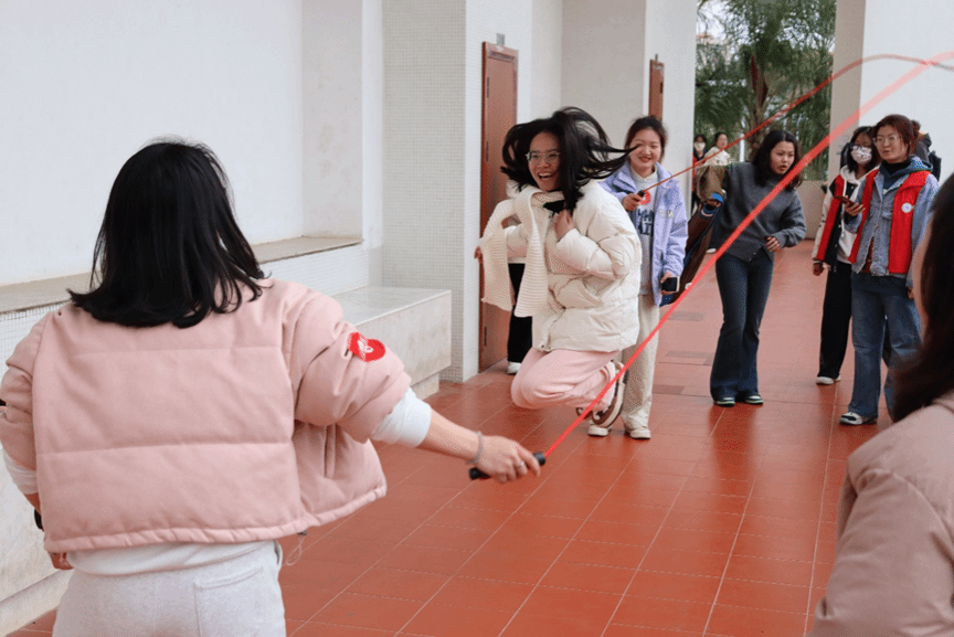 以“绳”会友,彼此配合,默契情谊从中生。参赛者们接替跳绳,绳影翻飞,他们配合默契,脚步轻快,彰显了团队精神与青春风采。