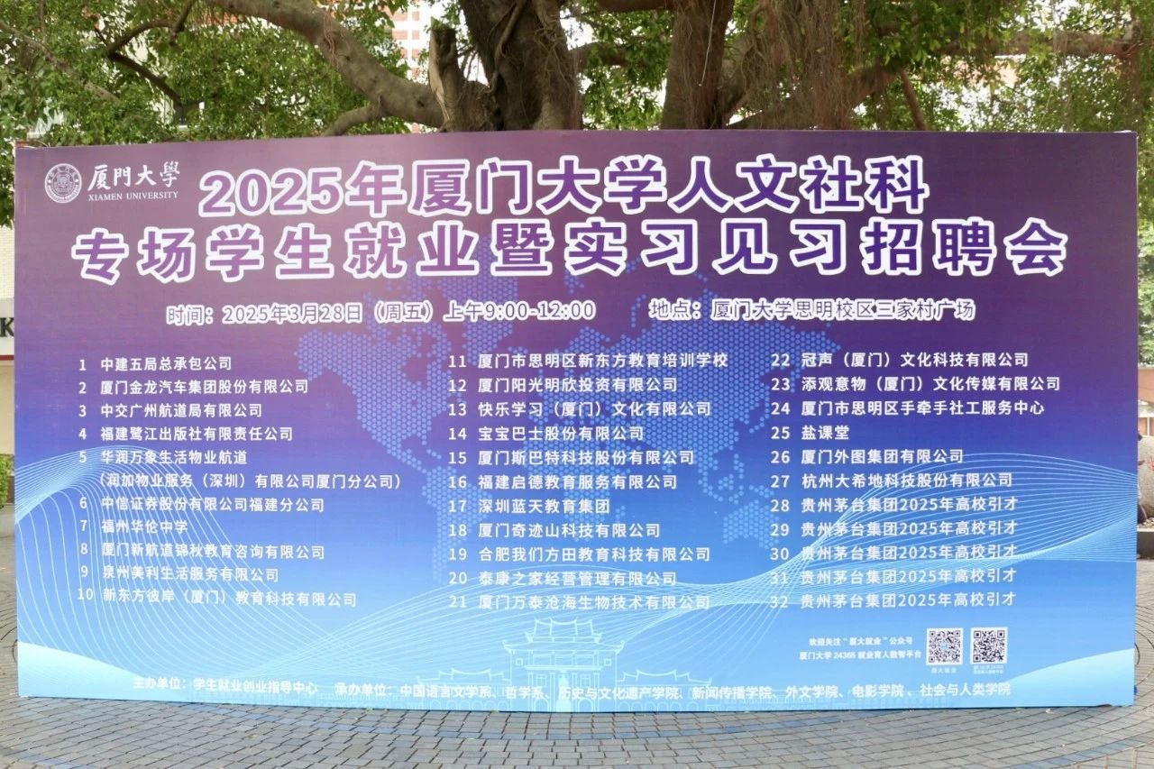 为促进我校2025届毕业生高质量充分就业,助力学生拓展就业渠道、提升职业竞争力,为广大学子创造更多就业与实习机会,3月28日上午,厦门大学人文社科专场学生就业暨实习见习招聘会于思明校区三家村广场顺利举办。