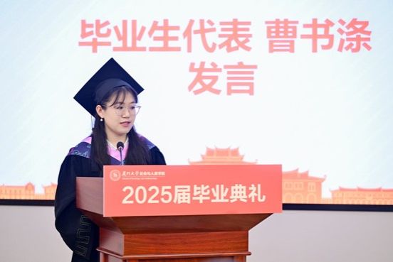 洪海松代表学院党委向圆满完成学业、即将踏上人生新征程的毕业生们表示热烈的祝贺。他向毕业生们提出了三点殷切期望:一是以“信仰之光”引领方向,做勇担使命的奋进者。鼓励同学们坚定理想信念,将个人发展融入国家战略;二是以“社会情怀”扎根大地,做时代命题的答卷人,在社会实践中不断成长,成为社会发展与国家建设的有力参与者、推动者和见证者;三是以“嘉庚精神”砥砺品格,做终身学习的践行者。将嘉庚精神内化于心、外化于行,不断学习,在变动不居的时代中守住初心、担当责任。