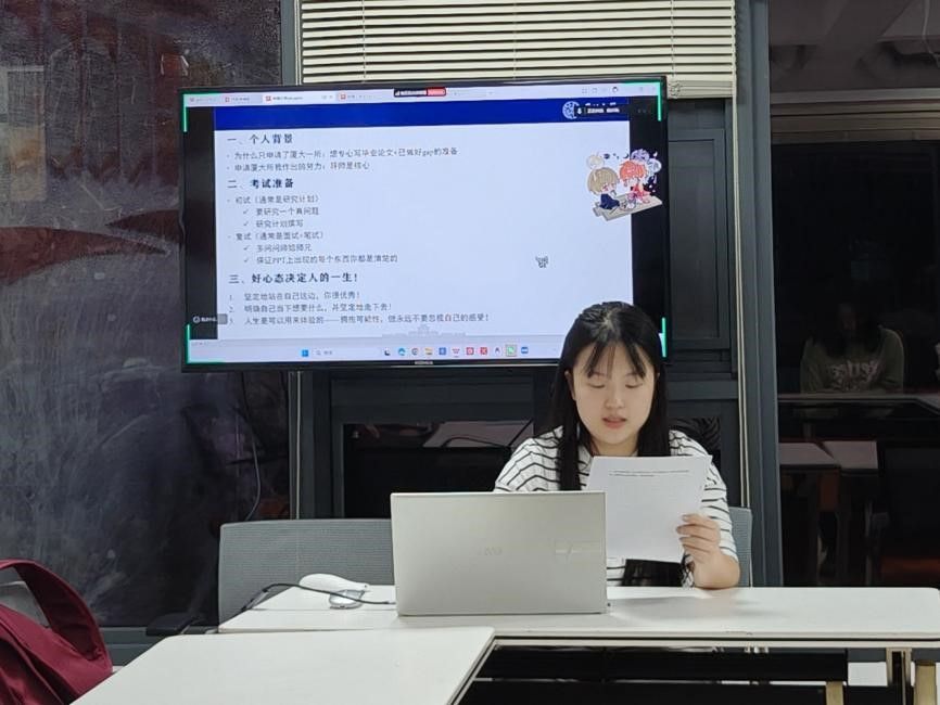 马怡乐强调了选择博士生导师的重要性。她表示,导师一方面决定了读博期间的学习质量,另一方面也决定了博士生在学期间的研究方向。她提醒同学们要与意向导师充分沟通,找到适合自己的科研方向。马怡乐分享了国内申博的几种主要形式,介绍了学院硕博连读相关规定,建议硕士生们提前做好学术和科研规划。