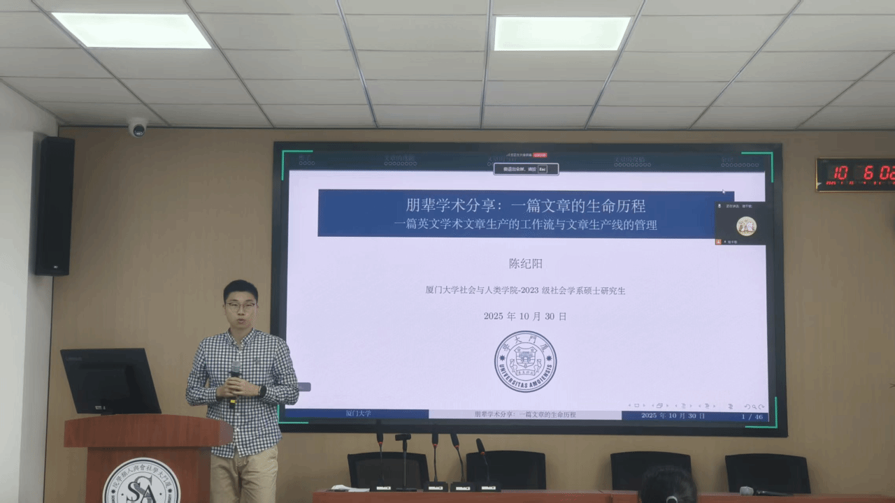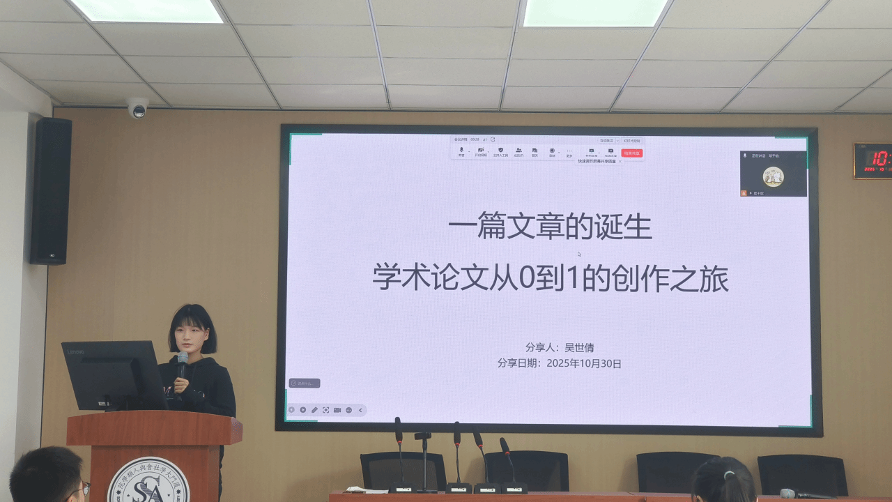 10月30日,我院举办主题为“一篇文章的诞生:学术论文从0到1的创作之旅”分享活动,本次活动邀请2024级硕士生吴世倩和李诗雨、2023级硕士生陈纪阳作为分享嘉宾,从选题灵感、研究设计到投稿返修,将论文写作与投稿的实战心得倾囊相授,助力社人本研学子提升学术论文写作能力。