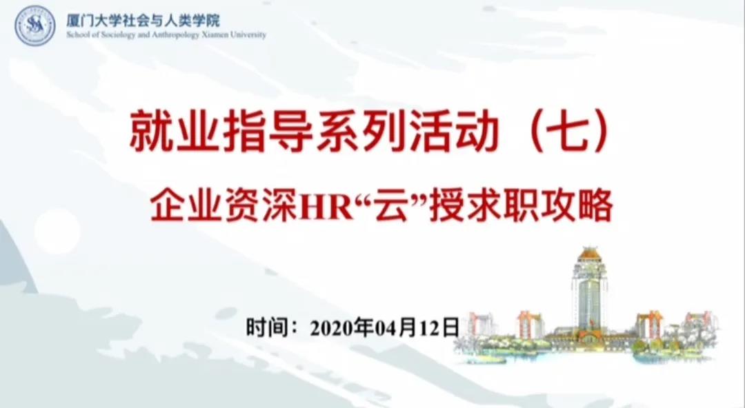 4月12日晚,由厦门大学社会与人类学院主办的就业指导系列活动(七)之企业资深HR“云”授求职攻略分享会在腾讯会议平台顺利开展。本次讲座由厦门象屿化工有限公司人力资源总监蒋诣君老师主讲,院学生会就业促进部负责人库得来提主持,学院党委副书记毛毛老师、辅导员冉丽莎老师、以及120多名来自不同院系的同学们共同参加。