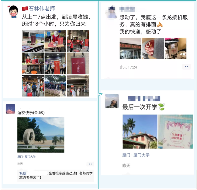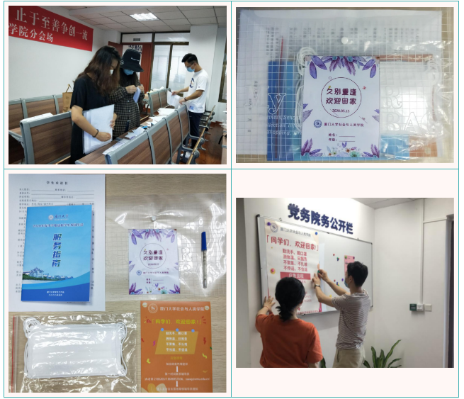 校内志愿者分别在各个宿舍楼栋迎接抵校同学,并为他们发放学院贴心准备的防疫资料袋