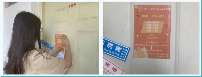 5月14日,在校志愿者到各宿舍楼栋张贴防疫安全宿舍门贴,让同学们在最需要的时候,能第一时间找到辅导员的联系电话。