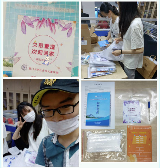 5月28日,师生志愿者分装防疫健康资料袋、张贴宿舍防疫门贴,为返校同学们备好防疫物资和安全指南。