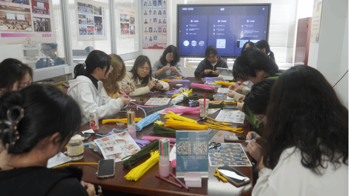 讲座结束后,活动进入了轻松有趣的手作环节——“芳华自在”扭扭棒花束DIY。同学们以小组为单位,使用现场提供的所有材料,跟随彩印教程,开启了一场指尖的创作之旅。指尖缠绕、弯折、组合,一根根平凡的扭扭棒逐渐变幻成一朵朵独具匠心的“永生花”。大家将对自己、对身边女性、对未来生活的美好祝福与想象,都编织进这束永不凋谢的花束中。活动现场欢声笑语不断,在沉浸式的手作体验中,同学们不仅感受到了手工创作的乐趣与成就感,更在协作与分享中加深了彼此的情谊。