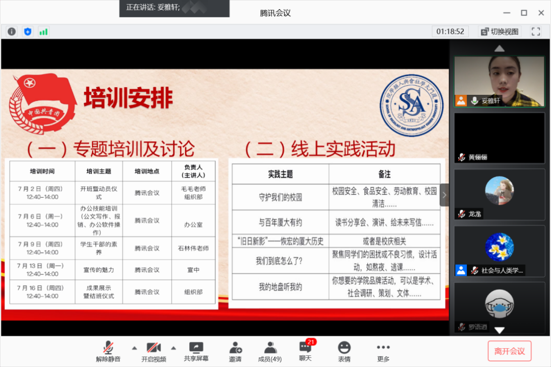 为打造一支政治觉悟高、思想品德正、感召能力强、业务能力精的学生骨干队伍,提高学生组织的力量,促进我院学生工作的和谐发展,社会与人类学院第一届学生骨干培训班开班暨动员仪式于2020年7月2日举行,本次活动的主题为“激扬青春活力·献礼百年校庆”,号召我院学生工骨干用热爱与责任筑牢学生工作的四梁八柱,将青春与热血献礼百年校庆。